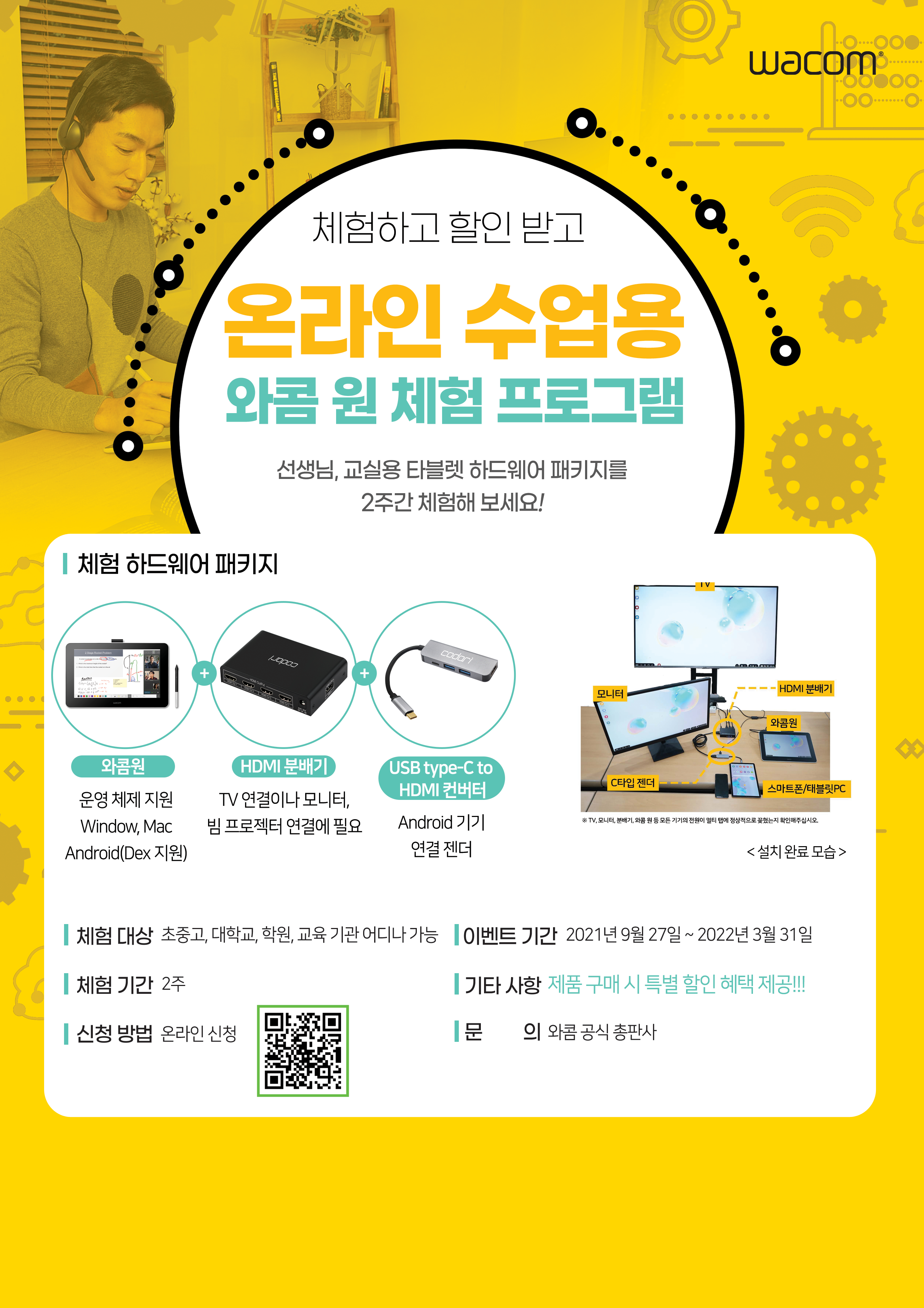 전국의 학교, 학원 선생님을 비롯한 교육기관 종사자분들은 주목해주세요! 와콤이 전국 초·중·고등학교, 대학교, 학원 등 교육기관 대상으로 액정타블렛 와콤 원을 직접 사용해볼 수 있는 체험 프로그램을 실시합니다. 최상의 온라인 교육 솔루션을 제공하는 이번 체험 프로그램은 2021년 9월 29일 (수)부터 2022년 3월 31일 (목)까지 진행됩니다.