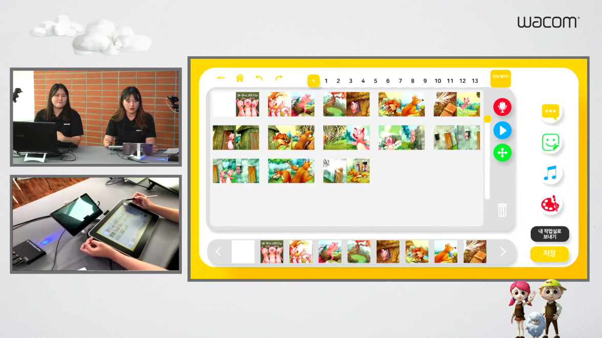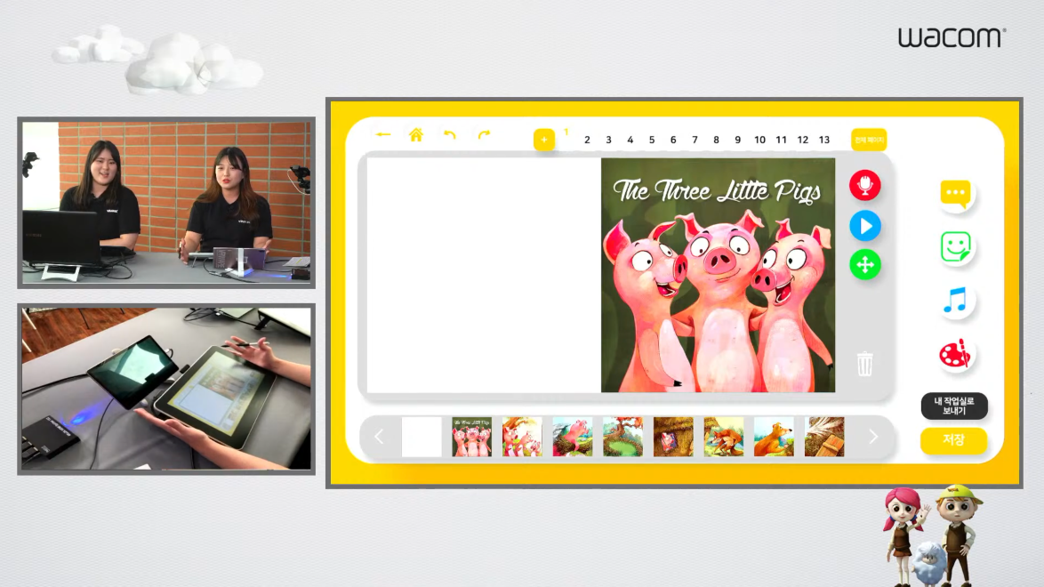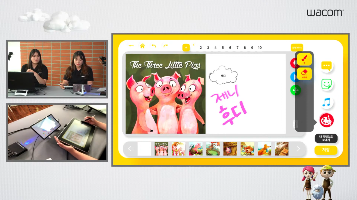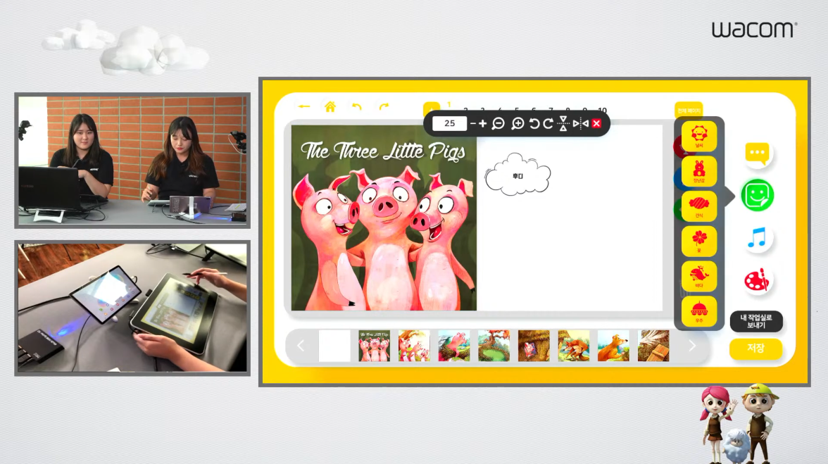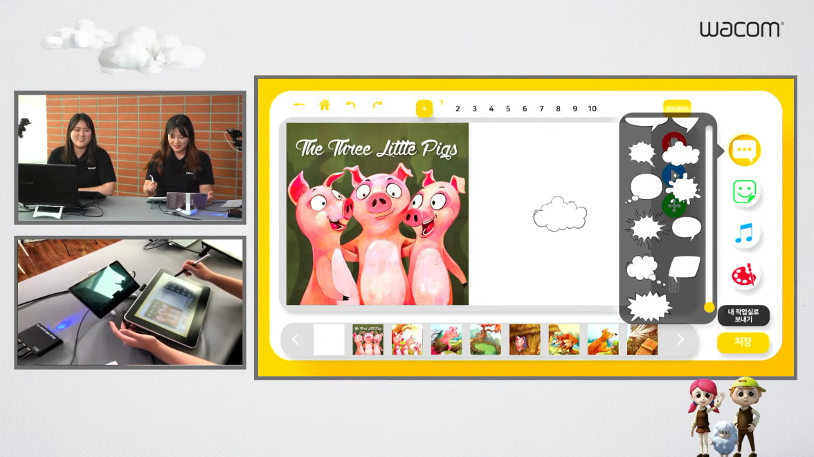 연구원분들은 아기돼지 삼형제를 선택하셨네요. 전체 페이지를 눌러서 이야기가 어떻게 구성되었는지 확인할 수 있고, 맘에 들지 않는 페이지는 휴지통에 넣어서 삭제하면 됩니다. 플러스(+) 버튼을 누르면 빈 화면을 추가할 수도 있고요.