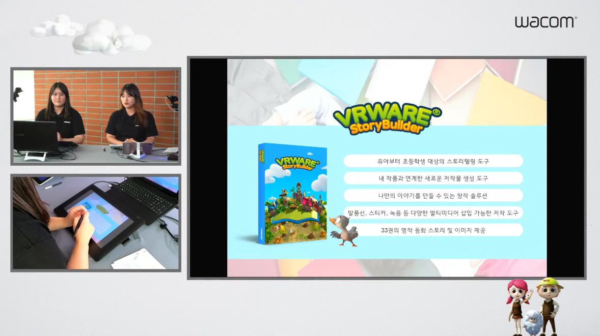 특히 이번 웨비나에서 다루는 VR웨어 스토리빌더와 VR웨어 스쿨은 와콤 타블렛과 함께 사용함으로써 시너지를 발휘하고 학생들과 선생님들에게 좋은 반응을 얻고 있어요. 와콤 타블렛을 호환 가능한 안드로이드와 연결하면 쉽고 편하게 사용할 수 있답니다. 이제 두 프로그램을 차례대로 소개해볼게요!