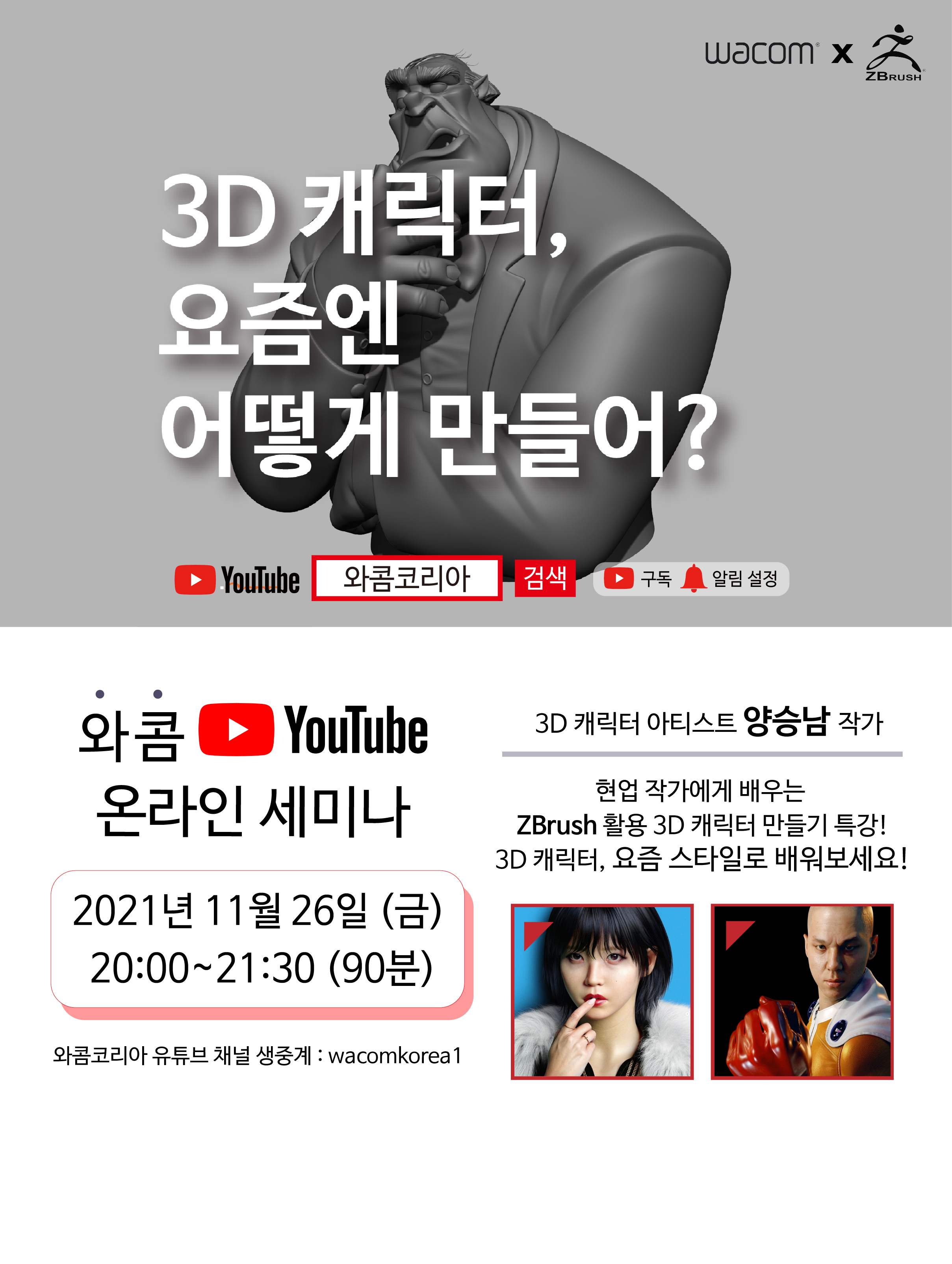 11월 26일 오후 8시부터 9시 30분까지 와콤 공식 유튜브 채널에서 실시간으로 방송되는 와콤 웨비나. 채널 구독 및 알림 설정을 해 두면 세미나가 시작할 때 알림을 받을 수 있어요. 또한 타블렛 유무와 관계없이 누구나 참여 가능하니, 평소에 Zbrush나 3D 모델링에 관심이 있거나 궁금했던 분들은 놓치지 마세요!