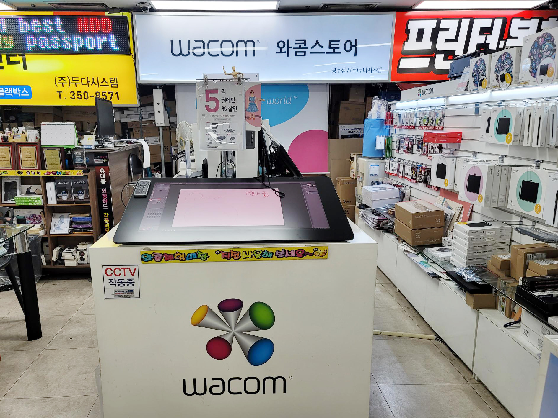 방문 A/S 접수가 가능한 마지막 와콤스토어는 광주점입니다. 광주 서구 화정동에 있는 와콤스토어 광주점 '두다시스템'에 오시면 와콤 제품군을 체험할 수 있으며, 제품 상담도 가능합니다.