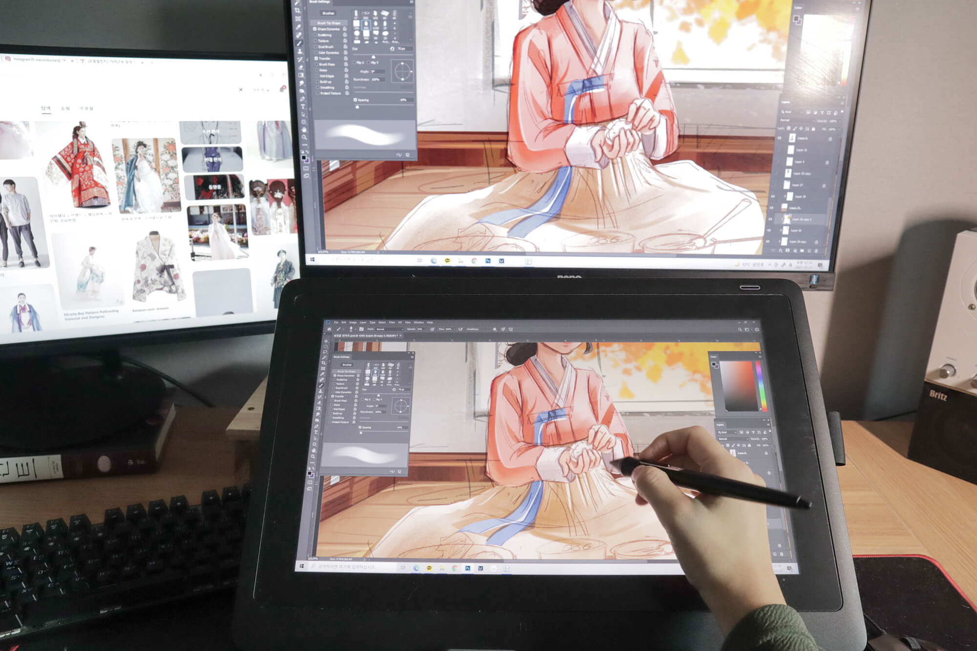 A. 오랜 고민 끝에 신티크16을 구매했는데요, 걱정했던 액정 유리 두께도 전혀 불편하지 않았고, 필압이 자유자재로 조절되어서 좋아요. 듀얼 모니터로 색감 체크를 하는 편이라서 사용에 전혀 어려움이 없습니다.