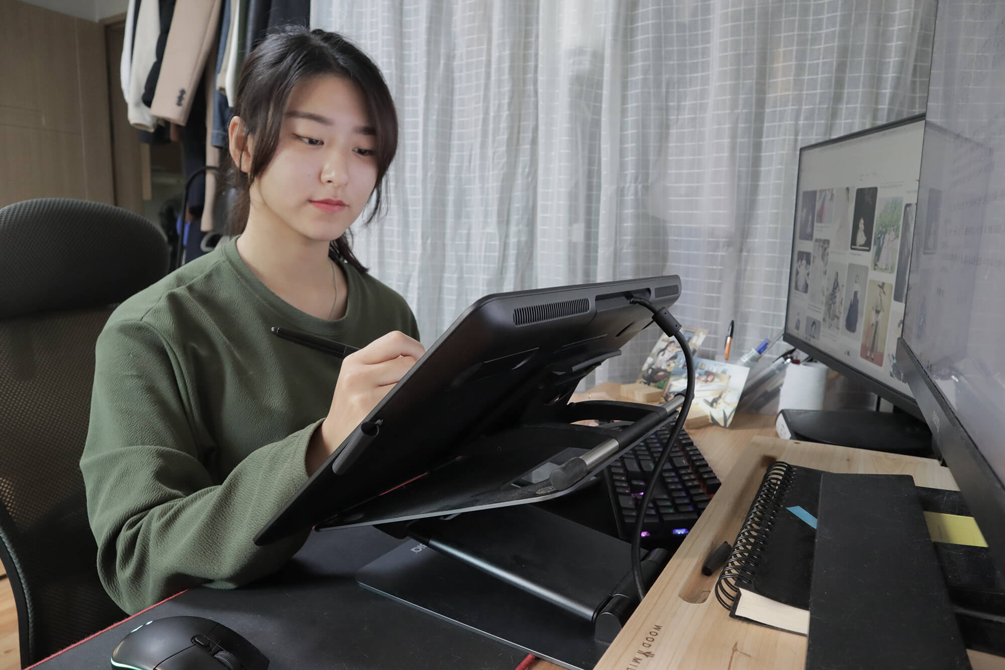 A. 기존에는 아이패드로 스케치 및 채색 작업을 했는데, 신티크16을 구매한 후에는 포토샵을 사용합니다. 펜타블렛에 잘 적응하지 못해서 마음에 드는 선을 그리기 어려웠는데, 액정타블렛을 산 후에는 액정 위에 직관적인 드로잉이 가능하고, 단축키를 쓸 수 있어서 보다 효율적이더라고요. 그리고 목 건강을 위해 노트북 받침대를 따로 장만해서 받침대 위에 신티크16을 올려서 사용하고 있습니다.