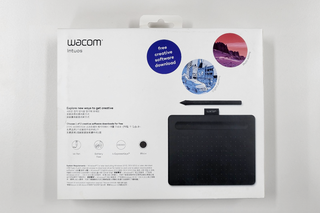 인튜어스 소형 상자의 앞면과 뒷면입니다. 아주 귀여운 일러스트가 눈에 띄네요! 번들 소프트웨어를 다운로드할 수 있다는 free creative softeware download 안내 문구도 적혀 있습니다. 뒷면에서는 간단한 제품 특징을 확인할 수 있어요.
