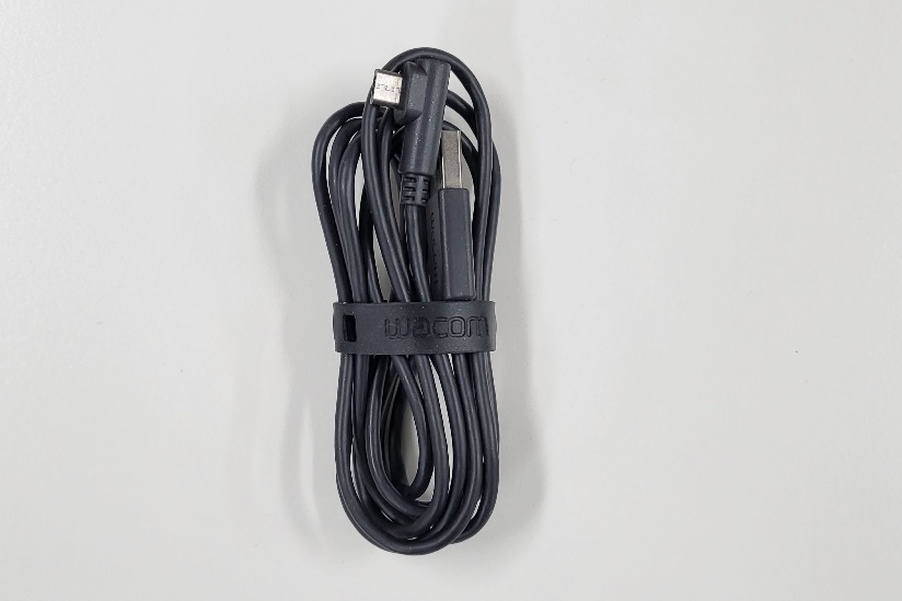 케이블의 양 끝을 보여드리겠습니다. 왼쪽은 PC에 연결하는 USB-A 단자입니다. 오른쪽 단자는 인튜어스 측면 상단에 있는 포트에 연결해주세요.
