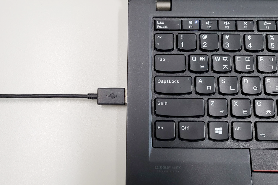 지난 시간에도 소개했듯이, 연결 케이블의 양 끝에는 USB-A 단자와 인튜어스 본품에 꽂는 L자 커넥터가 있어요.