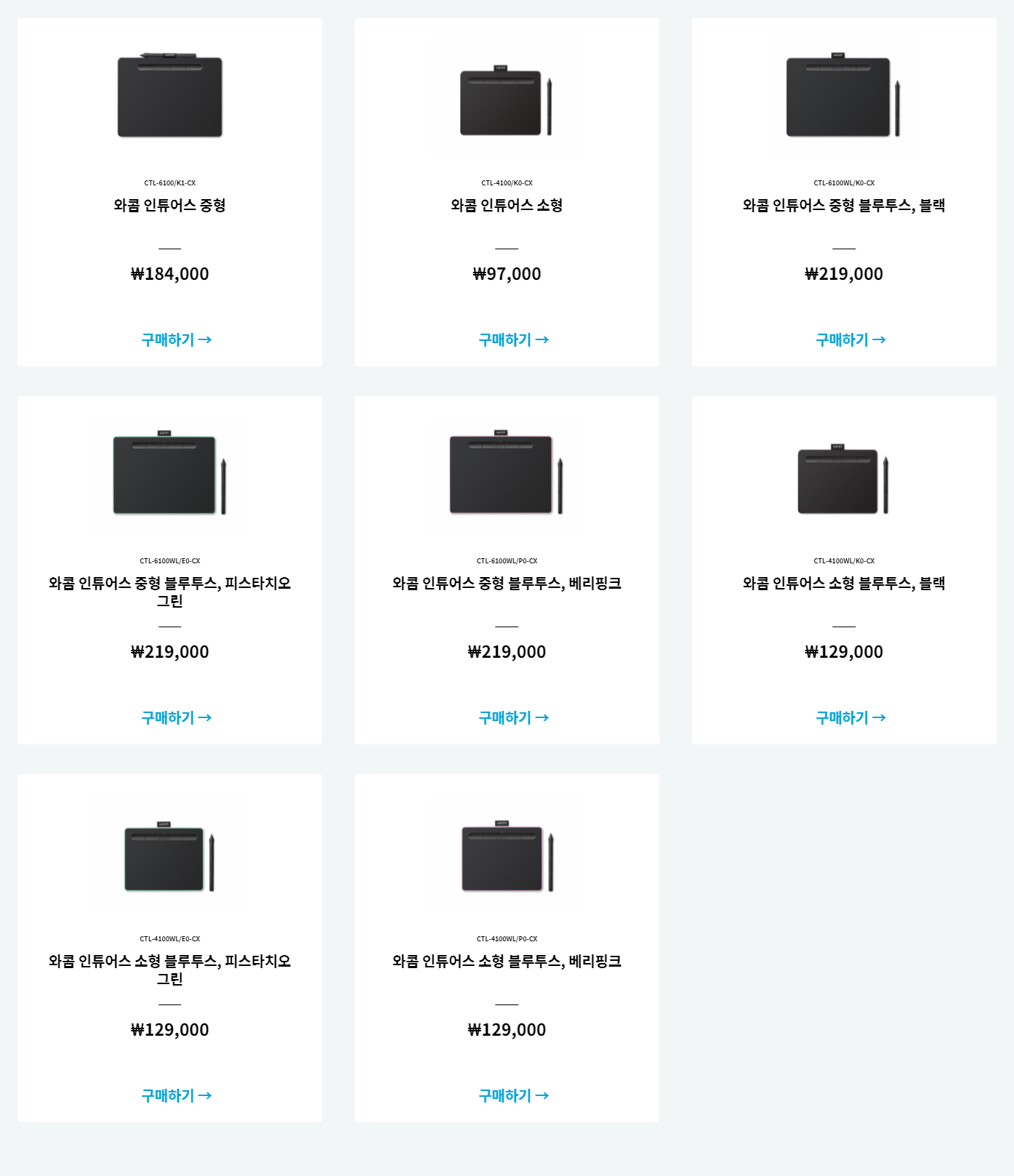 여기서 잠깐! 인튜어스는 유선 USB 케이블로만 연결 가능한 기본 모델과 블루투스, USB 연결이 모두 가능한 블루투스 모델이 있어요. 크기별로 소형과 중형 사이즈가 있고, 여기에서 연결 방법에 따라 다른 모델로 나뉘는 것입니다. 다음 시간에 소개할 블루투스 모델은 3가지 색상이 있고요.