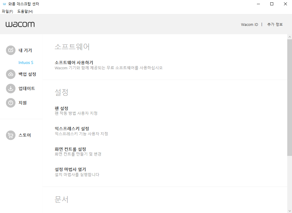 와콤 데스크탑 센터 창에서 내 기기에 등록된 것을 확인할 수도 있고요. 와콤 데스크탑 센터에서는 번들 소프트웨어 다운로드, 펜 설정, 익스프레스키 설정 등 다양한 설정 변경이 가능합니다. 해당 내용은 추후 소개하도록 할게요.