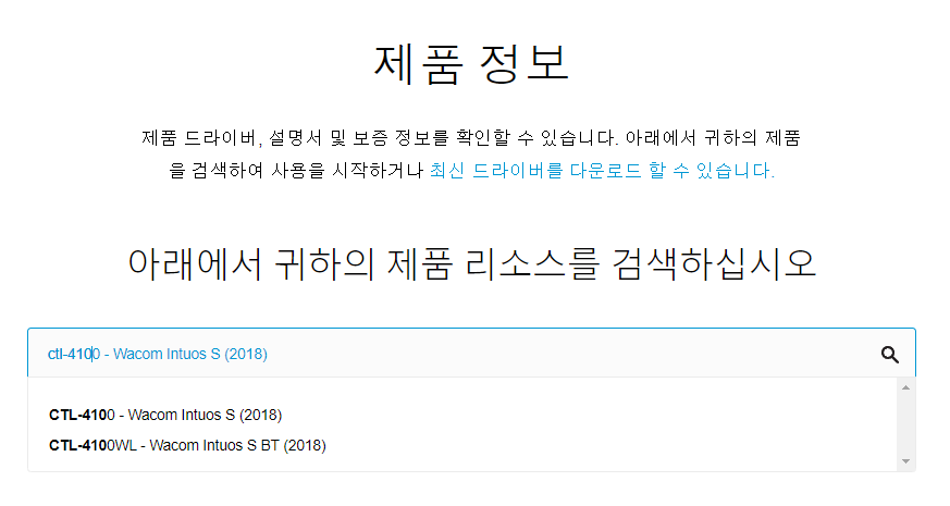 다 읽으셨나요? 그럼 인튜어스 드라이버를 설치해 봅시다. 검색 창에 모델명인 CTL-4100을 검색해주세요. 일반 USB 모델과 블루투스 모델이 함께 뜨는데, 이번 시간에는 일반 모델을 다루고 있으니, 위쪽 옵션을 선택하면 되겠지요.