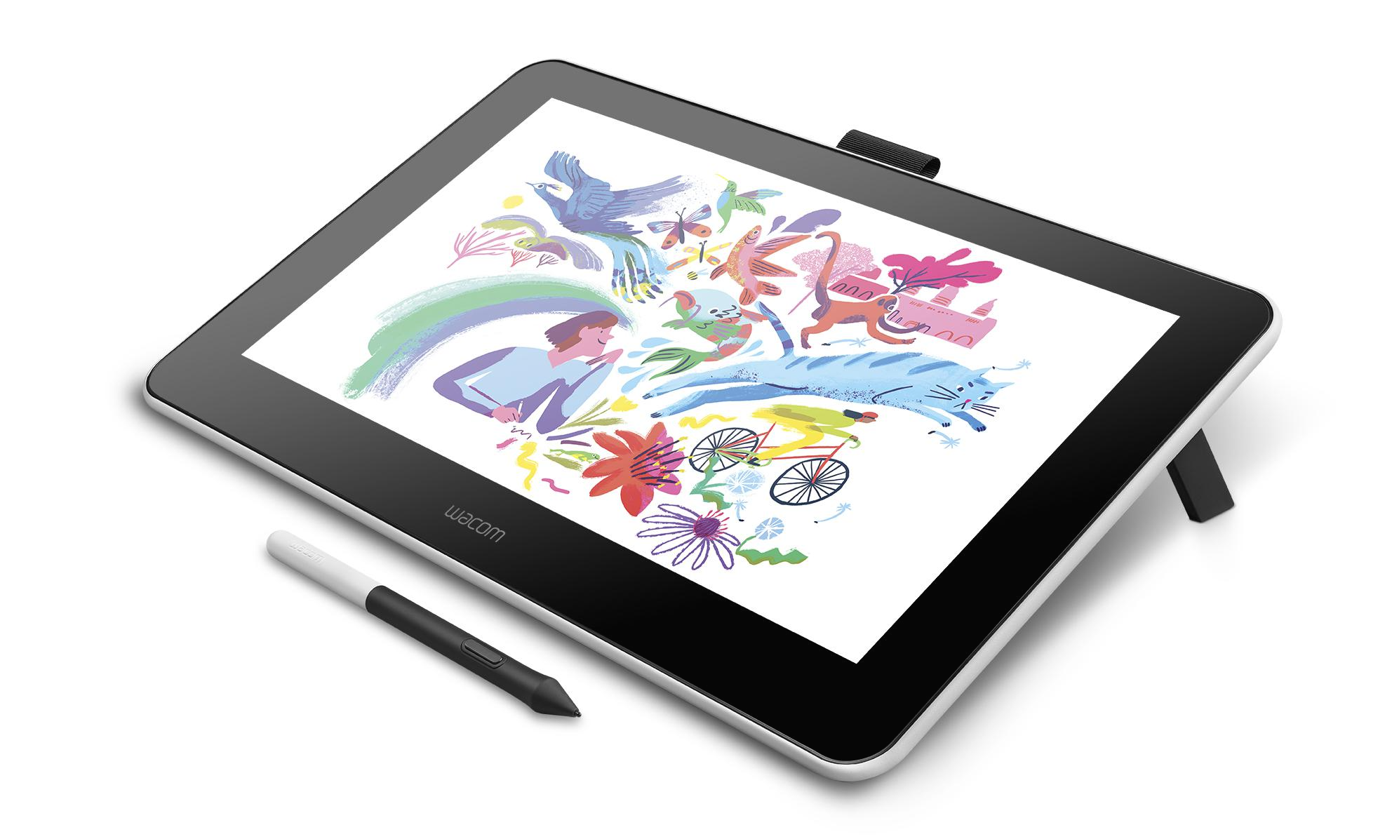 와콤 원은 약 13형의 스크린에 디지털 펜으로 그림을 그리거나 글씨를 쓸 수 있는 제품입니다. 화면에 손이 닿더라도 인식하지 않는 팜리젝션을 지원해 초보자도 쉽고 직관적으로 작업할 수 있는 점이 특징입니다. 액정에 자꾸 손이 닿아서 불편한 일이 생기지 않지요.