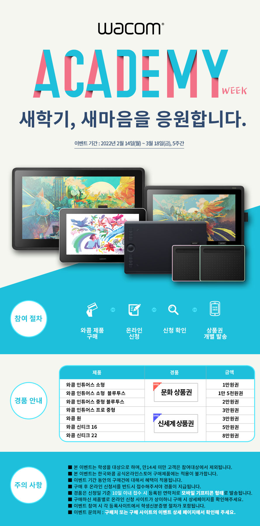 2022년이 시작된 지 얼마 되지 않은 것 같은데, 추웠던 날씨가 점점 따뜻해지고 있어요. 그리고 대망의 새 학기도 함께 다가오고 있죠! 와콤이 새 학기를 맞이하여 학생 고객에게 상품권을 증정하는 '와콤 아카데미 위크' 프로모션을 실시합니다.
