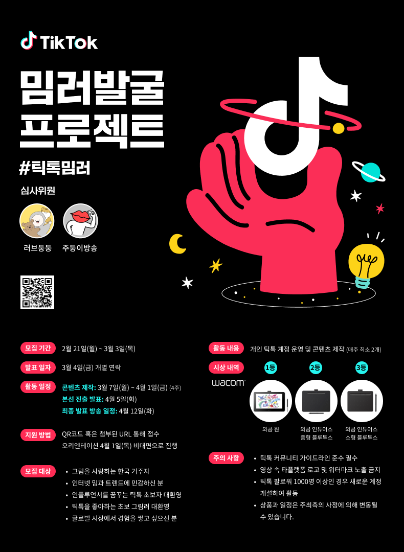 와콤 타블렛을 겟! 할 행운의 주인공, 바로 여러분이 될 수 있습니다. 틱톡을 처음 하더라도, 틱톡을 잘 모르더라도 괜찮아요. 지금부터 시작하면 되니까요. 주저하지 말고 밈러발굴 프로젝트에 도전해보세요!