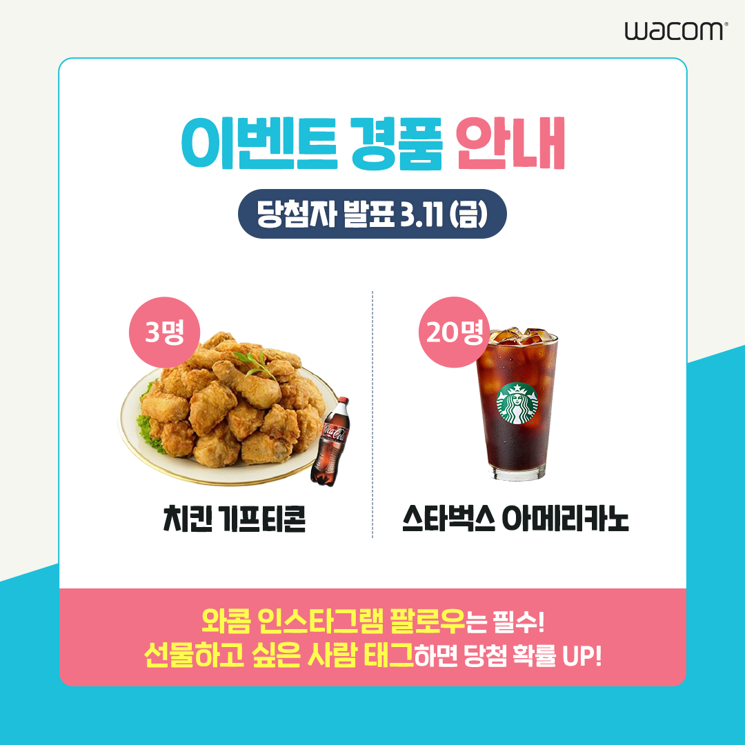 추첨을 통해 3명에게는 치킨 기프티콘을, 20명에게는 스타벅스 아메리카노 기프티콘을 드려요. 당첨자는 3월 11일(금)에 와콤 인스타그램 피드를 통해 발표할 예정입니다. 해당 이벤트는 인스타그램 전용 이벤트이며, 팔로워를 대상으로 진행하니 참여 전에 팔로우 꾹! 눌러주세요 :)