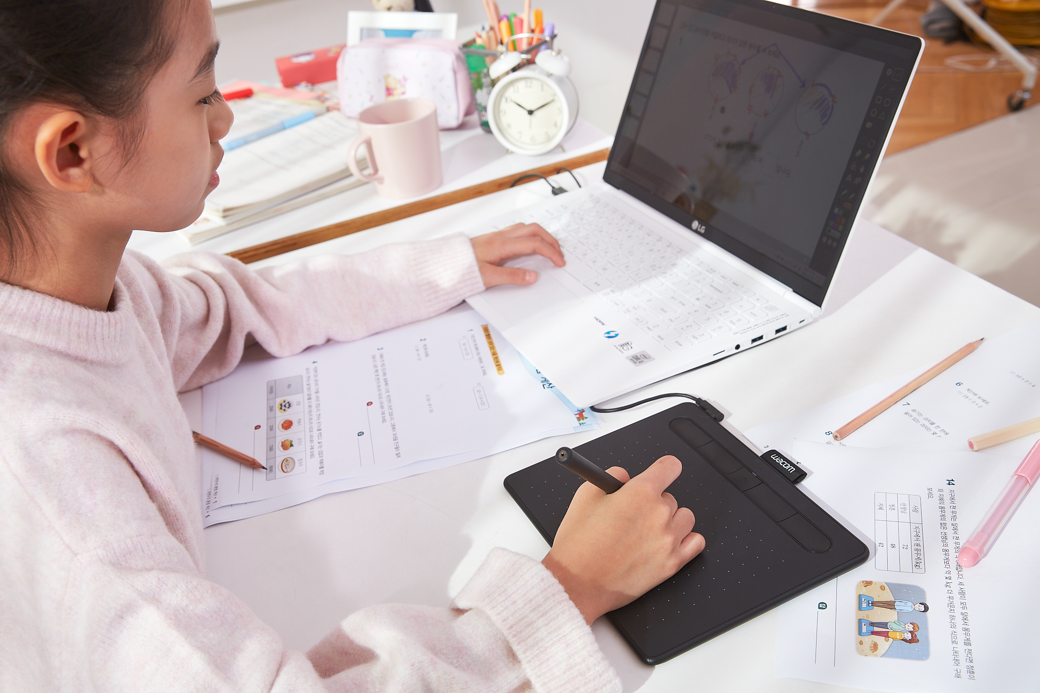 와콤 타블렛은 온라인 교육 필수템이라고 불릴 만큼 교육 현장에서 매우 유용한 기기입니다. 디지털 판서에 최적화된 여러 프로그램을 이용해서 고퀄리티의 판서가 가능하고, 학습 자료 등을 만들 때도 훨씬 편리해요. 게다가 쉬는 시간에는 디지털 드로잉, 컬러링 등 취미 활동도 할 수 있는 만능 디바이스랍니다.