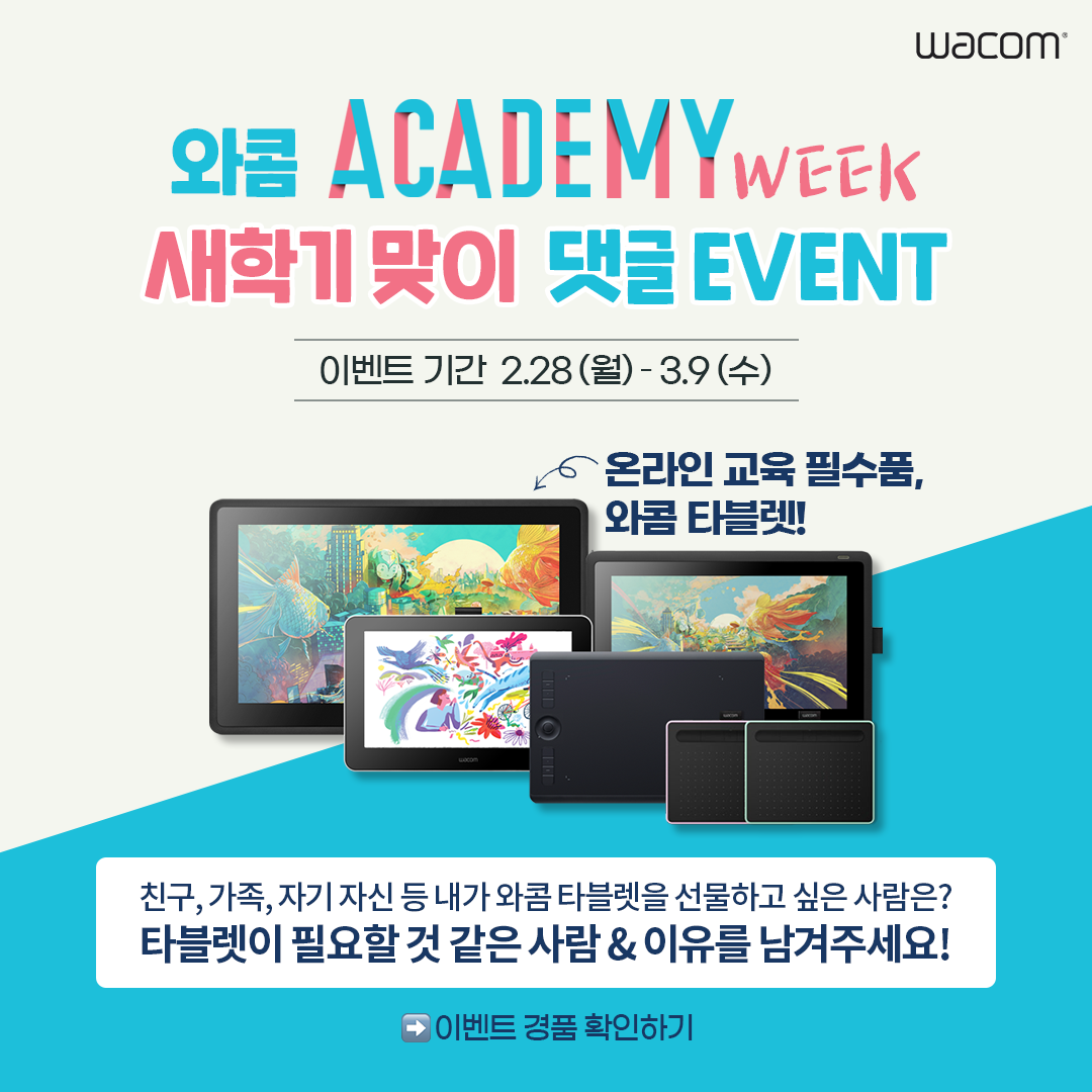 신학기는 개학, 개강 등 새로운 학교 생활이 시작되는 시기이기 때문에, 다양한 선물을 주고받곤 하는데요. 여러분이 와콤 타블렛을 선물하고 싶은 사람, 한마디로 와콤 타블렛이 필요할 것 같은 사람을 댓글로 작성해주세요! 이번 이벤트는 현재 진행 중인 와콤 아카데미 위크의 일환으로, 2월 28일(월)부터 3월 9일(수)까지 10일간 진행됩니다.