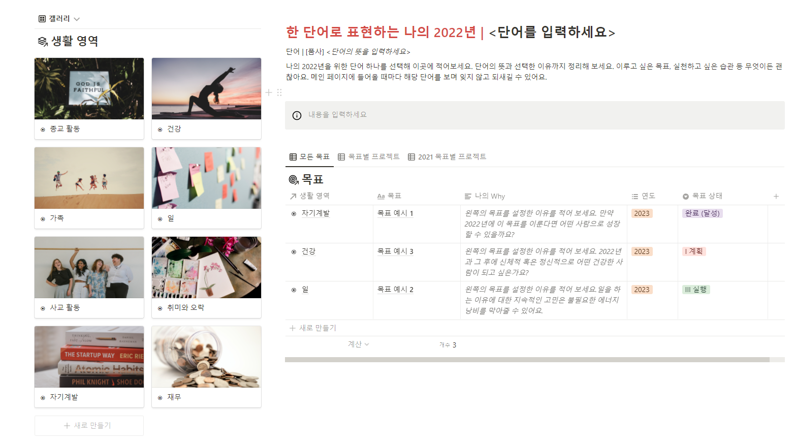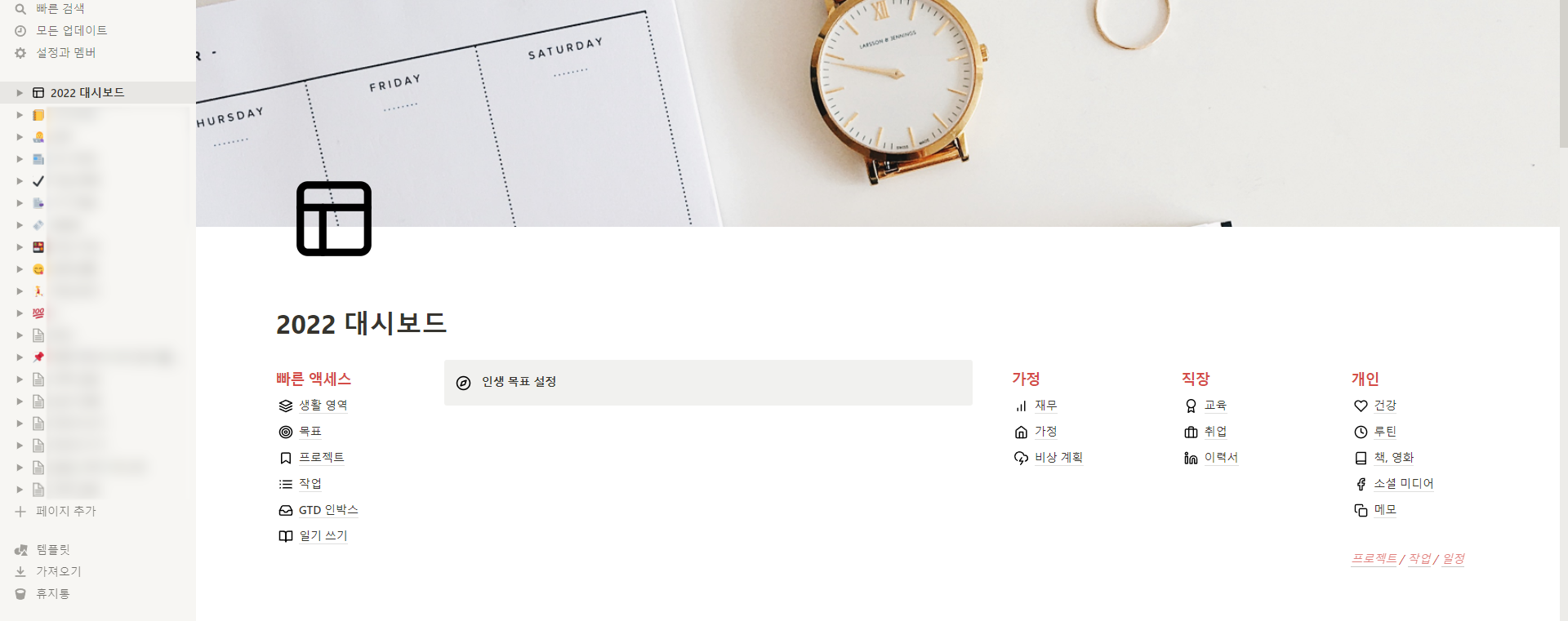 노션의 유용함을 극대화해주는 템플릿을 사용해도 좋습니다. 개인 사용자가 만들어서 배포하기도 하고, 노션 측에서 만들어 놓은 템플릿이 굉장히 많아요. 위 이미지는 노션이 2022년을 맞이하며 배포한 2022 대시보드 템플릿 기본 형태입니다. 다양한 형식으로 구성되어 1년을 정리하기에 딱 좋겠죠?!