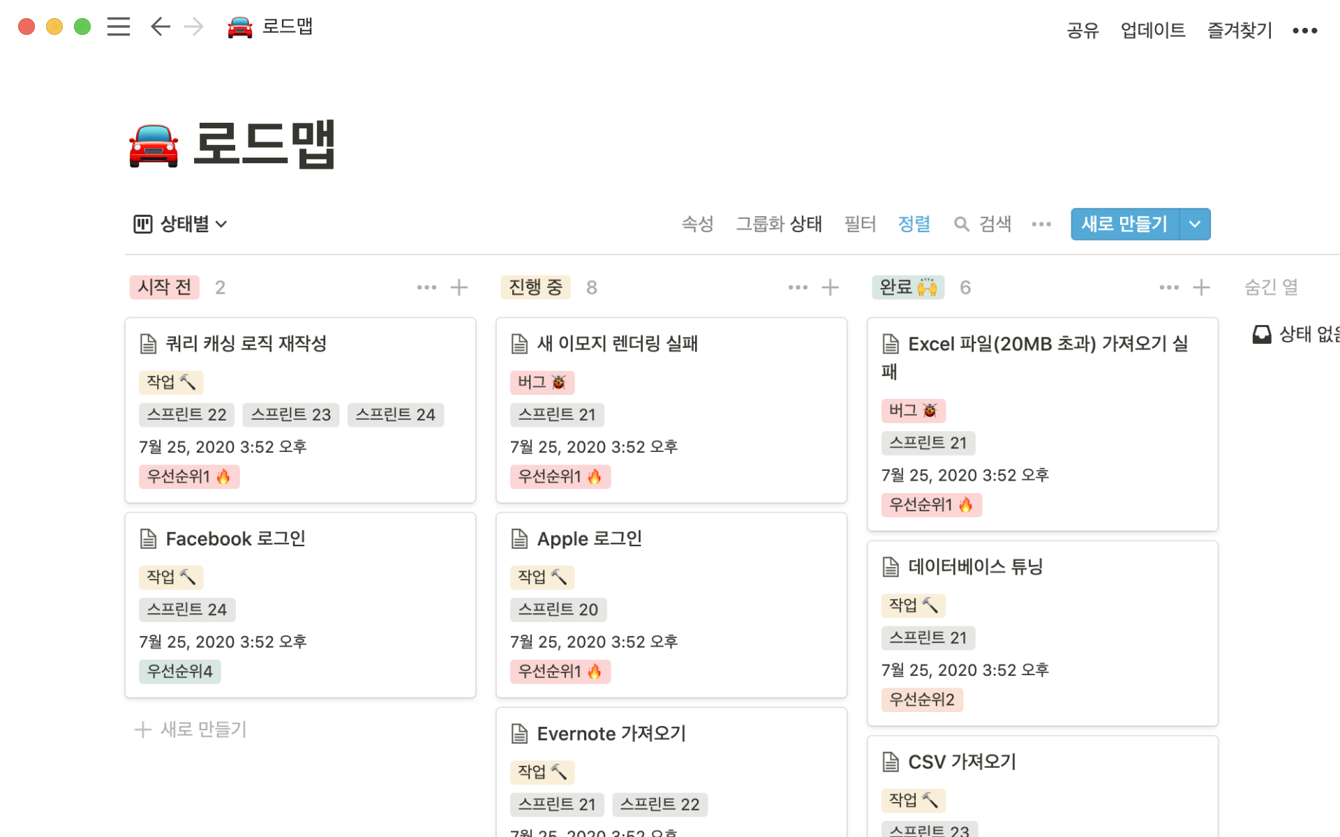 노션에서 기본적으로 제공하는 작업 목록 템플릿을 이용한 블로그 게시물 리스트입니다. 얼마든지 업무, 일상 영역 등에서 내가 원하는 내용을 담을 수 있습니다.