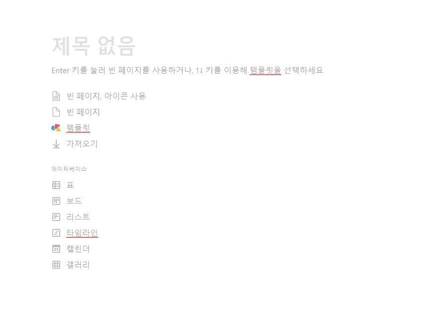 새 페이지 화면입니다. 우선 제목을 설정할 수 있고, 그 밑에 다양한 기능이 나와 있어요. 페이지 안에 페이지를 삽입할 수도 있고, 템플릿을 가져와서 사용할 수도 있습니다. 추가로 표, 보드, 리스트, 타임라인, 캘린더, 갤러리를 추가할 수도 있고요.