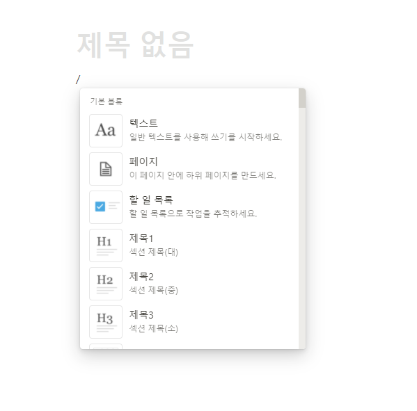 키보드에서 쉽게 볼 수 있는 '/' 버튼은 노션에서 명령 기능으로 쓰입니다. '/' 버튼을 누름으로써 텍스트부터 이미지, 체크리스트, 표, 보드, 캘린더, 갤러리, 동영상, 지도, 파일, 임베드, 코드 블록 등을 추가할 수 있어요. 정말 다양한 기능을 지원하지요?