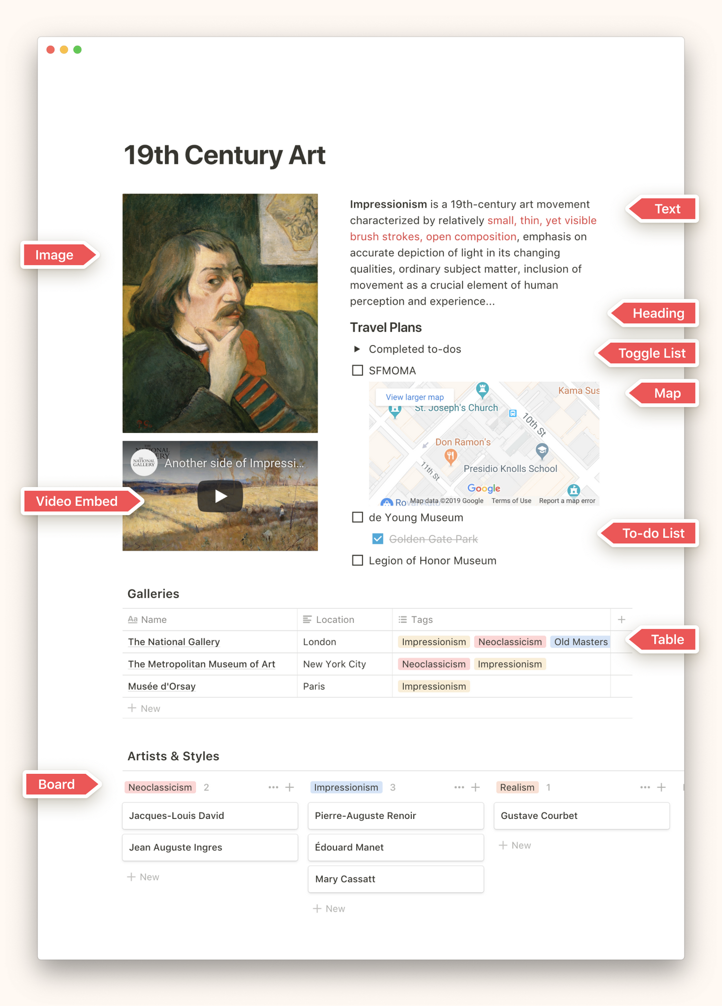 노션에서는 빈 페이지 공간에 내가 원하는 내용을 추가하여 자유자재의 모양으로 바꿀 수 있어요. 페이지에 추가하는 모든 텍스트, 이미지, 표 등은 하나의 블록 같은 개념입니다. 위 이미지의 모든 내용이 여러 블로그로 만들어진 게 보이시나요? 블록이 여럿 모여 하나의 페이지를 완성하게 된 것이죠. 블록 단위로 드래그하여 자유자재로 위치를 옮길 수 있답니다.