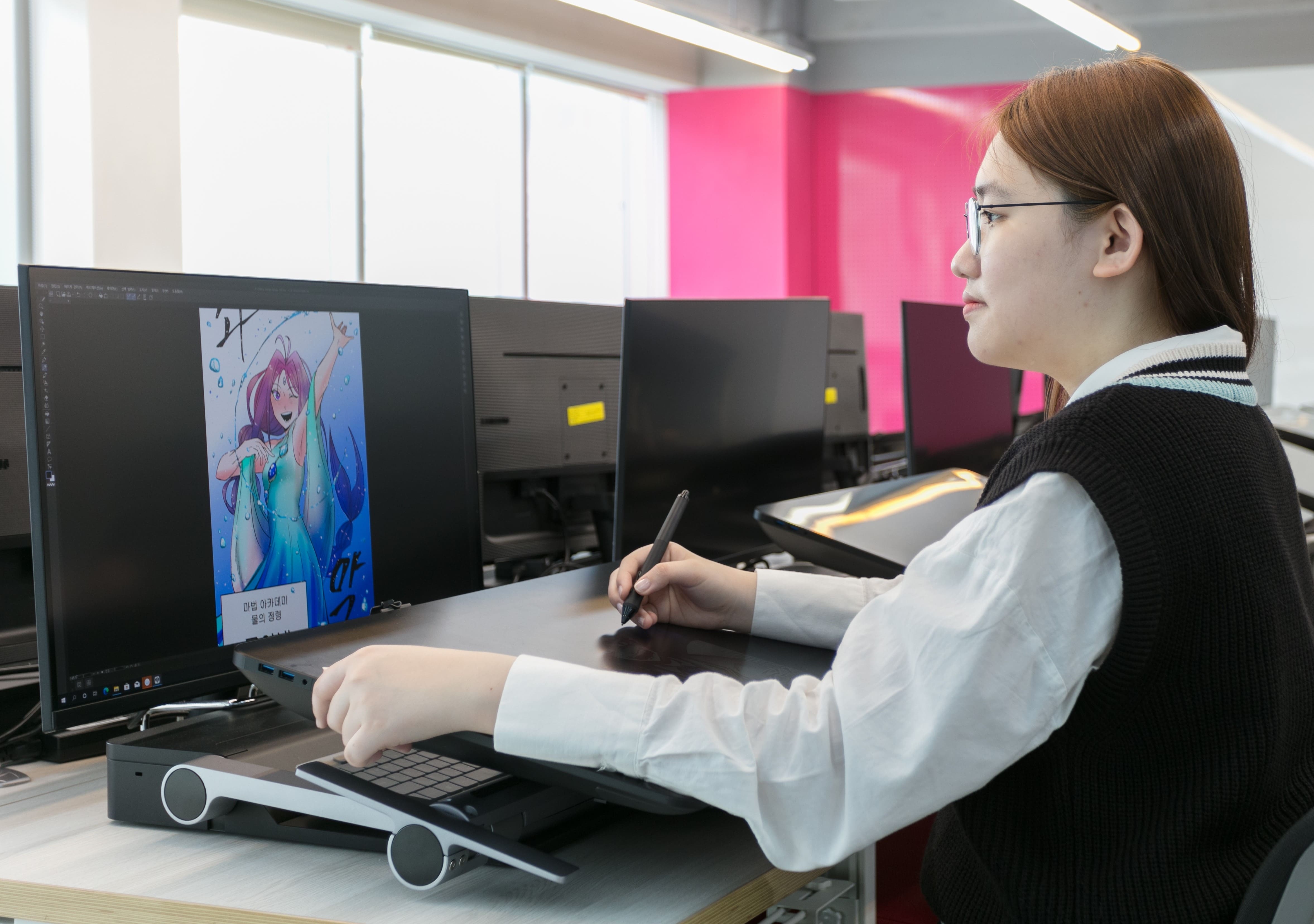 전국의 웹툰 및 디지털 그래픽 관련 학과가 있는 전국 특성화고, 대학교, 교육기관에는 와콤 타블렛 실습실이 마련되어 있는데요, 연성대학교 웹툰만화콘텐츠과 역시 와콤 신티크프로24와 에르고스탠드 풀 세트 75대를 구축한 창작 실습실을 운영 중입니다.