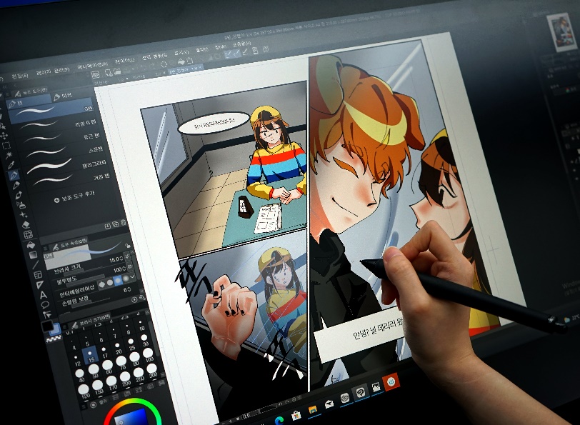 웹툰디지털전형은 일반적으로 실시되는 실기 시험과 동일한 방식으로 진행됩니다. 지원자들은 고사장에 입실해서 설치된 와콤 액정타블렛 신티크프로24를 사용해서 제시된 주제에 맞춰 웹툰 콘티를 작성합니다. 그리고 스케치 및 채색 과정을 거친 후 작업 파일을 저장하면 제출 완료입니다. 시간은 기존의 수작업 전형과 마찬가지로 4시간이에요.