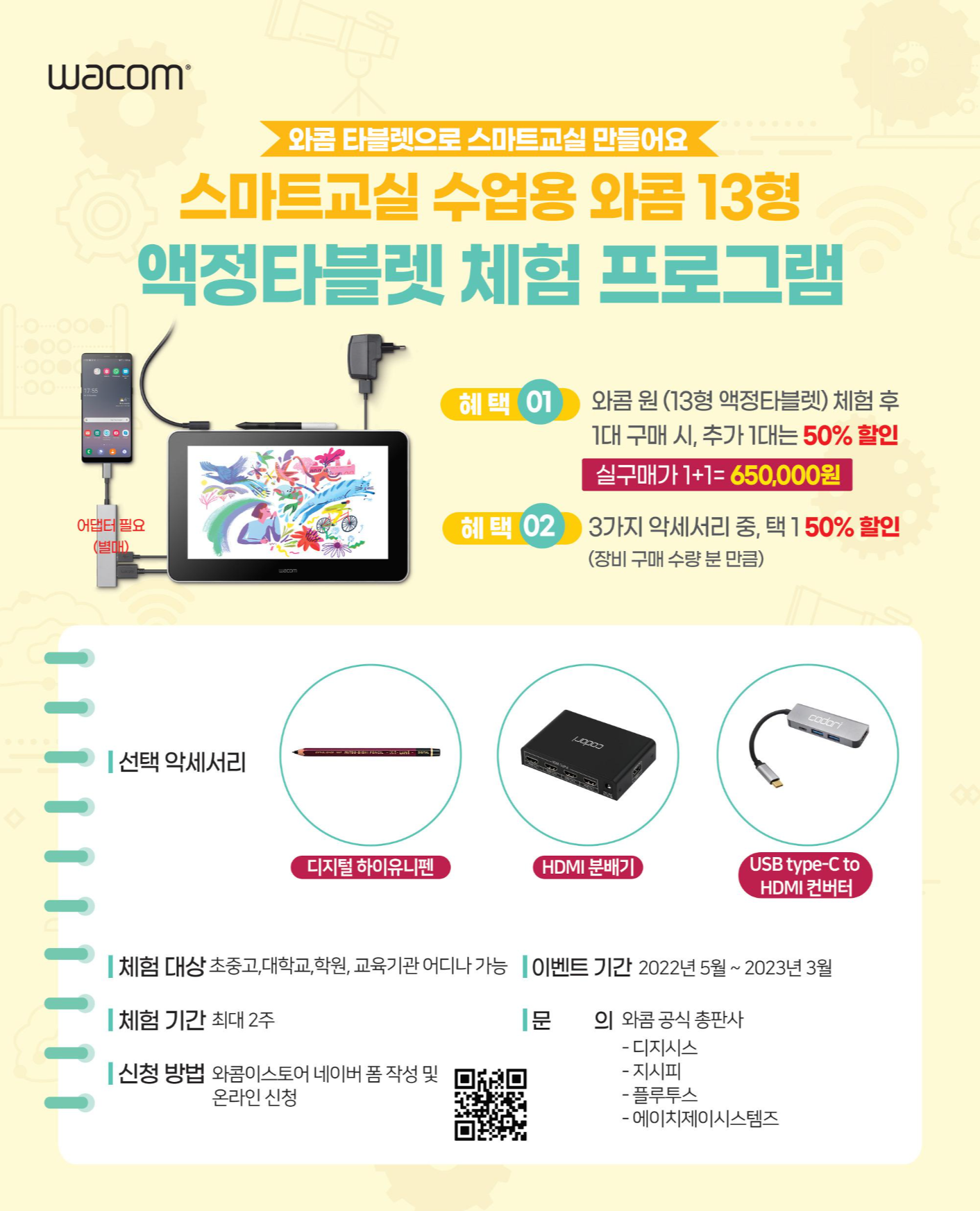 전국의 학교, 학원 선생님을 비롯한 교육기관 종사자들을 위한 절호의 찬스! 와콤이 전국 초·중·고등학교, 대학교, 학원 등 교육기관 대상으로 2주간 액정타블렛 와콤 원을 직접 사용해볼 수 있는 체험 프로그램을 실시합니다. 스마트교실에서 다양한 수업 진행 시 타블렛을 활용할 수 있는 이번 프로그램은 2022년 5월부터 2023년 3월까지 진행됩니다.