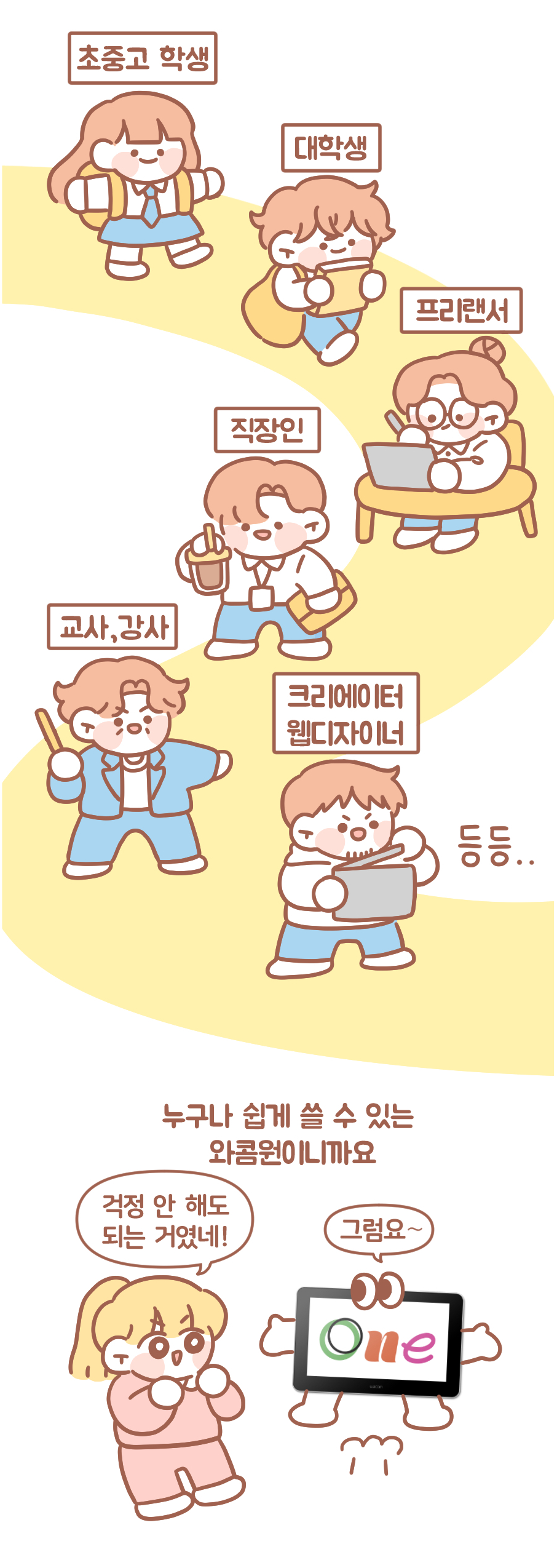 이렇게나 유용한 액정타블렛 와콤 원. 초등·중등·고등학교 학생은 물론이고 대학생, 프리랜서, 직장인, 교사·강사, 크리에이터, 웹디자이너 등 다양한 사람들에게 모두 추천합니다. 특히 입문자들에게는 강력 추천하는 크리에이티브 아이템이에요.