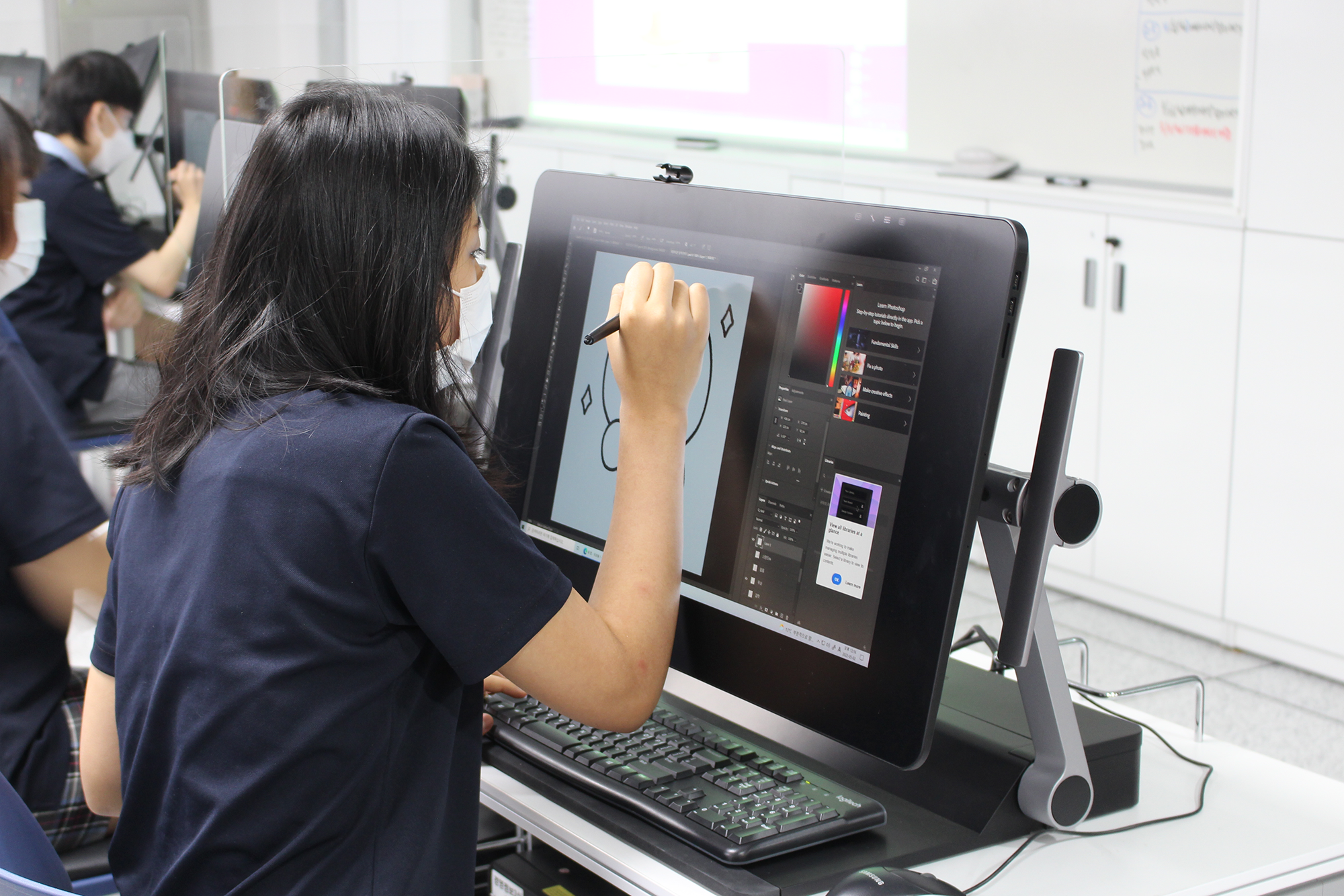 비주얼디자인과 신혜영 부장선생님에 따르면, 선생님들이 직접 타블렛 화면에서 필기와 드로잉을 선보이며 수업을 진행하기 때문에 이해도가 높아졌고, 직접 기기를 통해 실습하면서 학생들의 긍정적 피드백이 끊이지 않는다고 해요. 수업에 대한 흥미가 커지면서 적극적인 수업 참여로 이어진 것이지요.