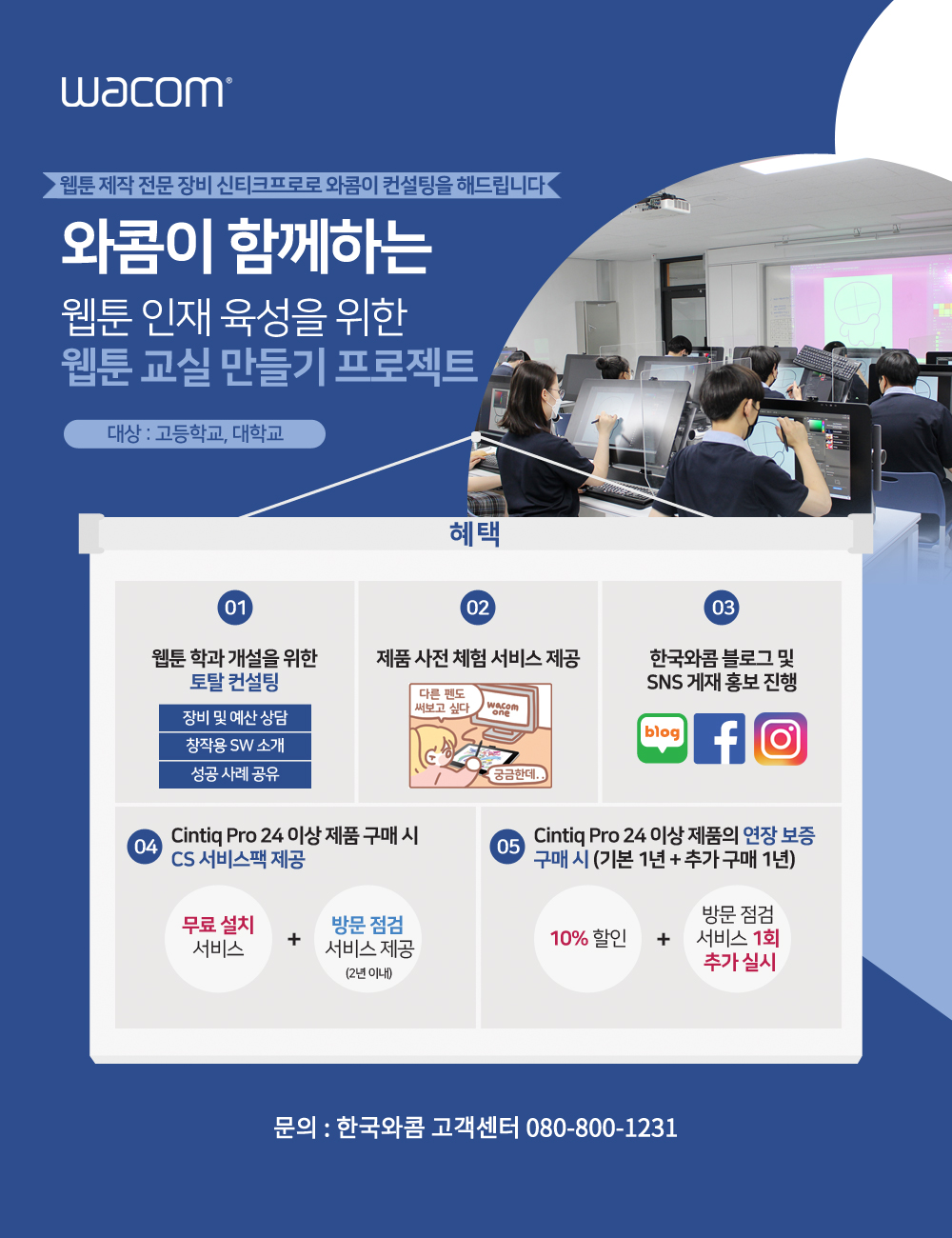장비부터 운영까지 와콤과 함께하는 웹툰 교실 만들기 프로젝트. 더욱 많은 고등학교와 대학교가 웹툰학과를 개설하고 창작 인프라를 갖출 수 있는 좋은 기회가 되길 바라요. 차세대 웹툰 스타의 탄생을 와콤이 함께 응원할게요! :)