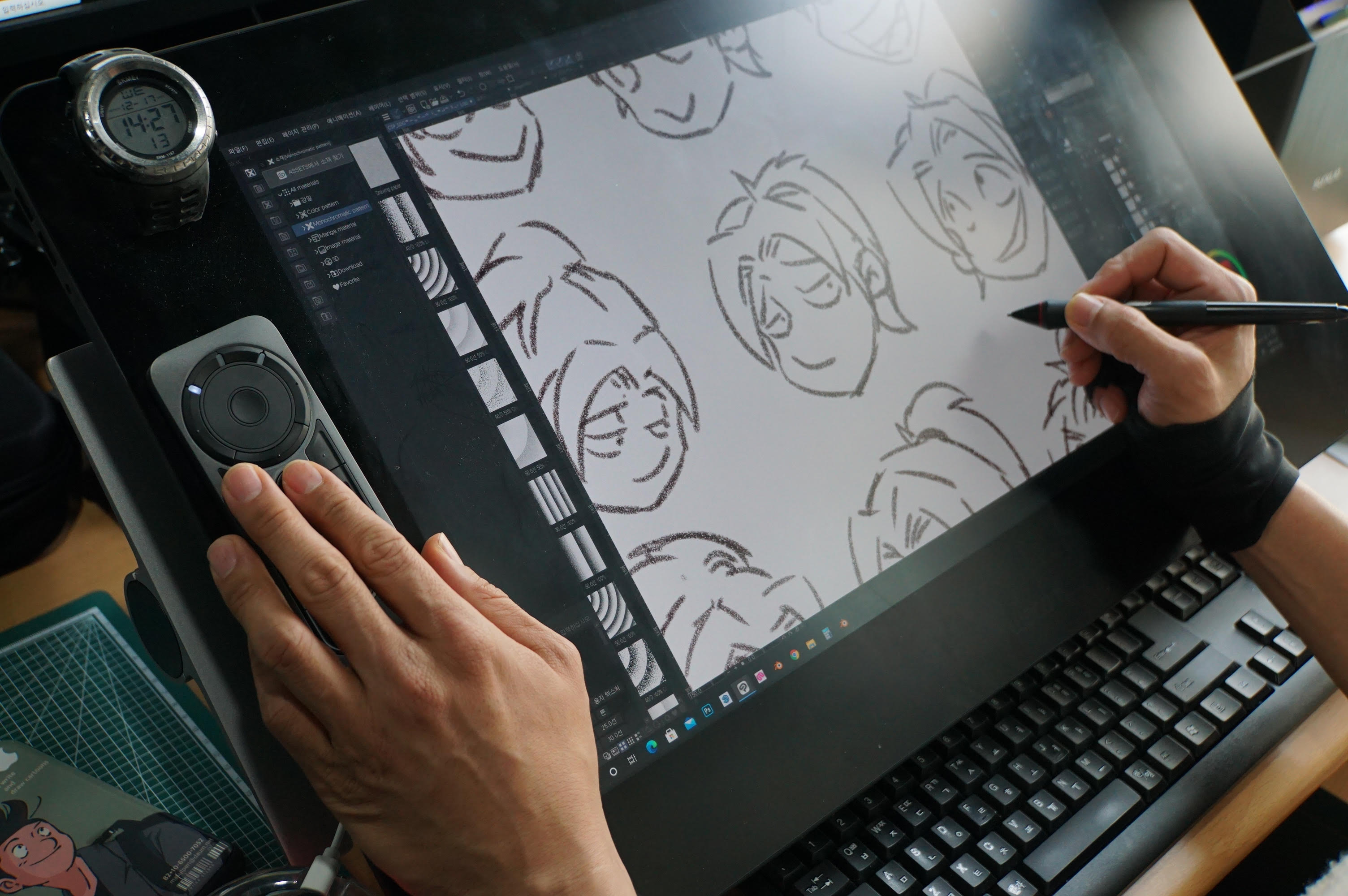 와콤 타블렛을 활용하여 작업에 몰두중인 작가님. 제품에 장착된 에르고 스탠드는 높이와 각도 조절, 회전 등을 비롯해 타블렛을 책상 끝으로 끌어와 작업자 몸에 밀착시켜 사용할 수 있도록 도와줍니다. 작업자에게 가장 완벽하고 편안하게 작업할 수 있는 각도를 제공한다고 볼 수 있지요!