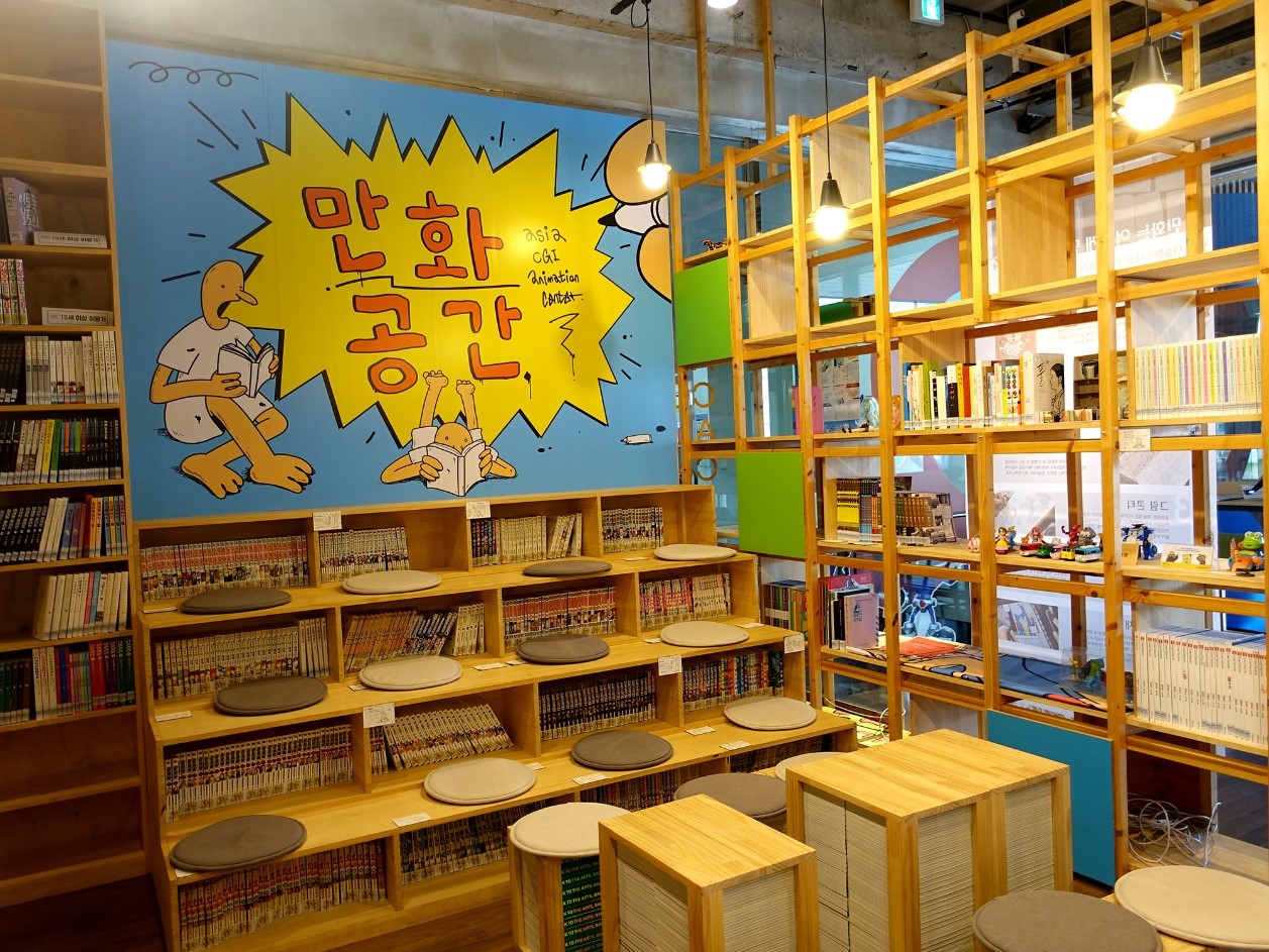 1층에 위치한 만화 공간은 다양한 만화책으로 빼곡히 채워져 있습니다. 원하는 작품이 있다면 1층 만화카페에서 감상할 수 있어요. 편하고 조용한 분위기에서 즐겁게 만화를 감상해보세요 :)
