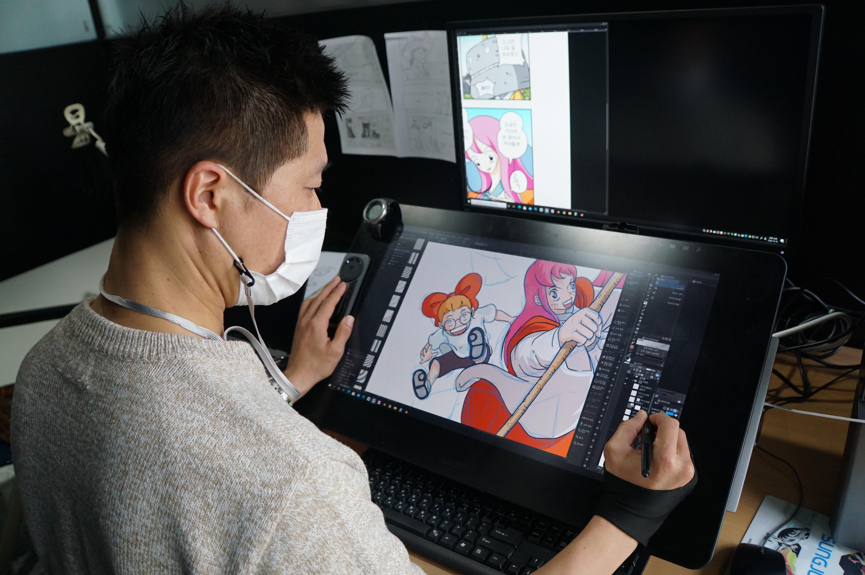 와콤 타블렛을 활용하여 작업에 몰두중인 작가님. 제품에 장착된 에르고 스탠드는 높이와 각도 조절, 회전 등을 비롯해 타블렛을 책상 끝으로 끌어와 작업자 몸에 밀착시켜 사용할 수 있도록 도와줍니다. 작업자에게 가장 완벽하고 편안하게 작업할 수 있는 각도를 제공한다고 볼 수 있지요!