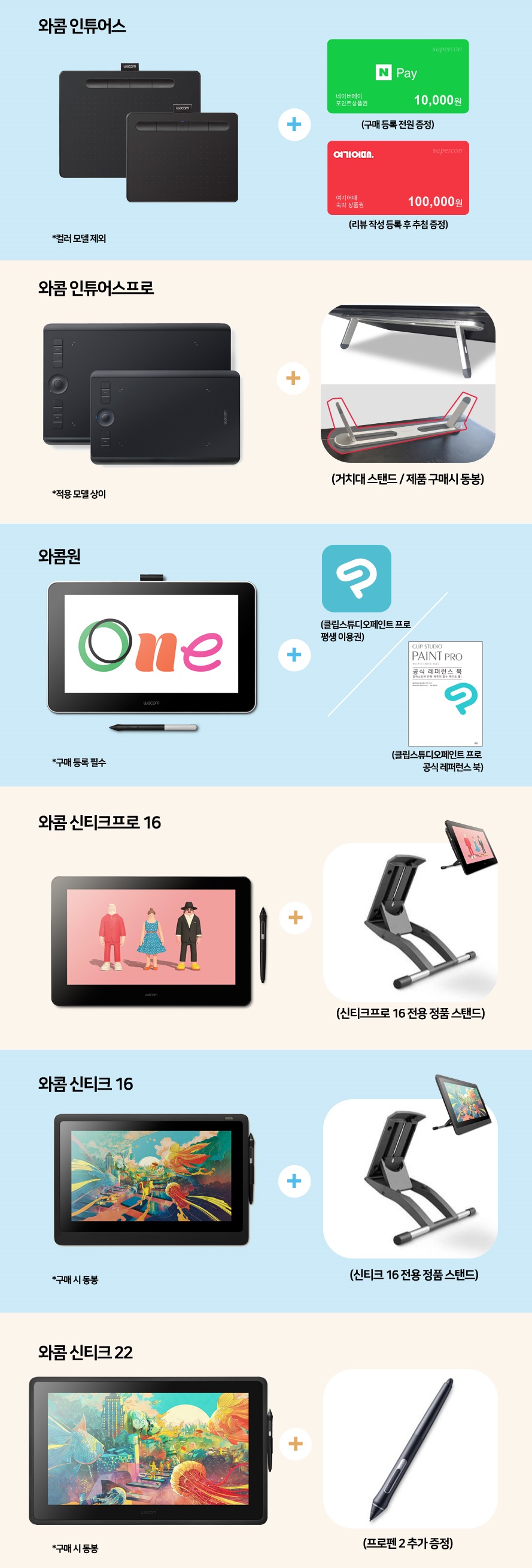 그리고 신티크16, 신티크프로16 구매자에게는 각 모델에 맞는 전용 스탠드가 제공되며, 신티크22 구매자는 타블렛에 사용 가능한 ‘프로펜 2’를 추가로 받을 수 있어요.