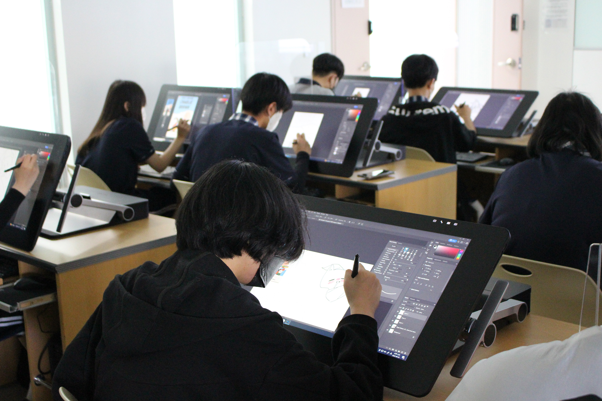 경기모바일과학고등학교는 올해 학과 재구조화 사업을 통해 창작 교육 인프라에 적극 투자했어요. 실습실 환경을 개선하면서 시각미디어 디자인실에 새롭게 ‘와콤 신티크프로24’ 풀 세트 26대를 구축한 것이 대표적입니다.