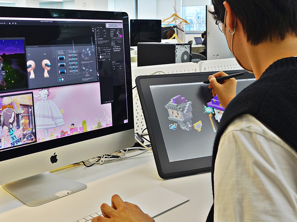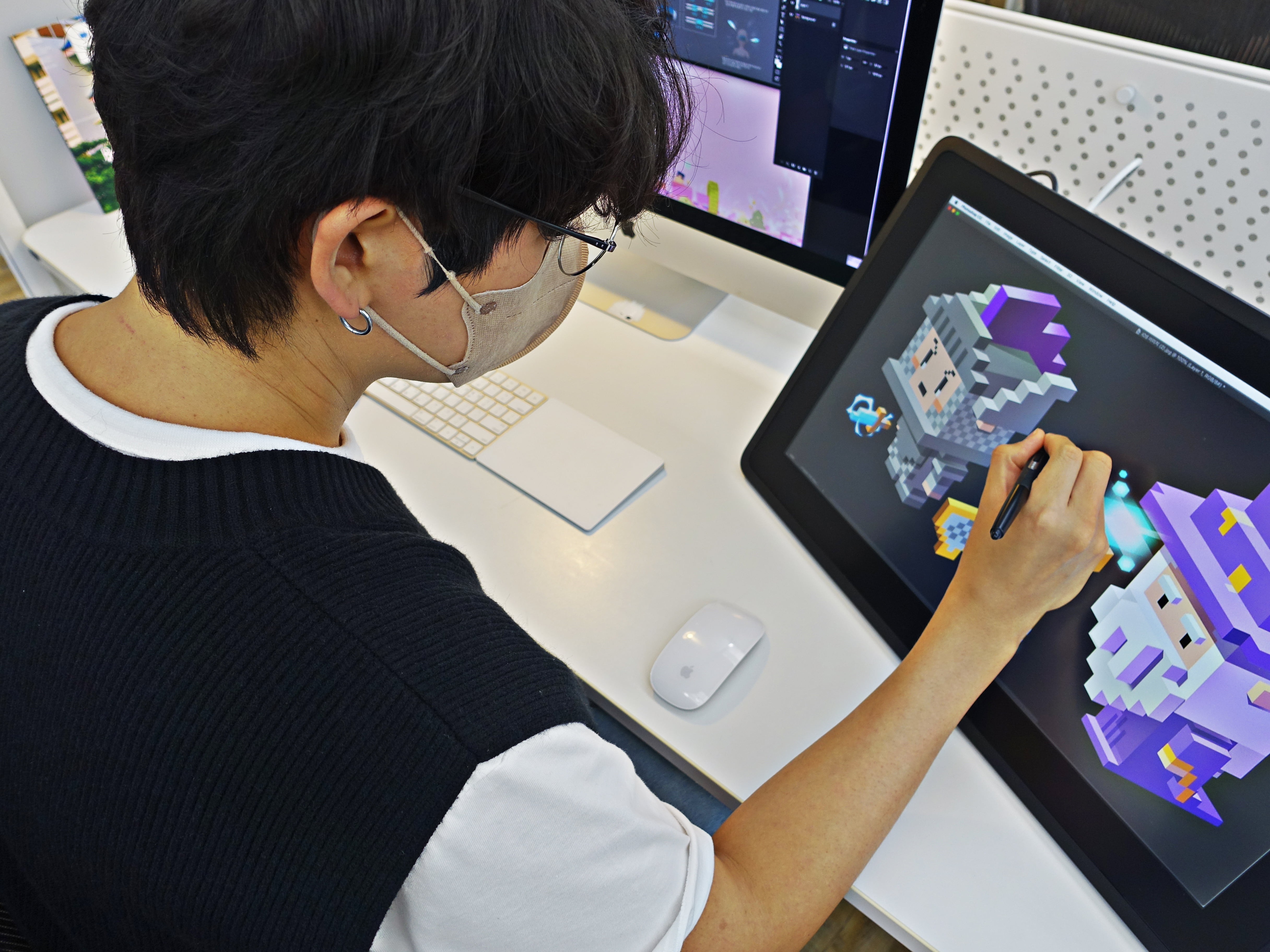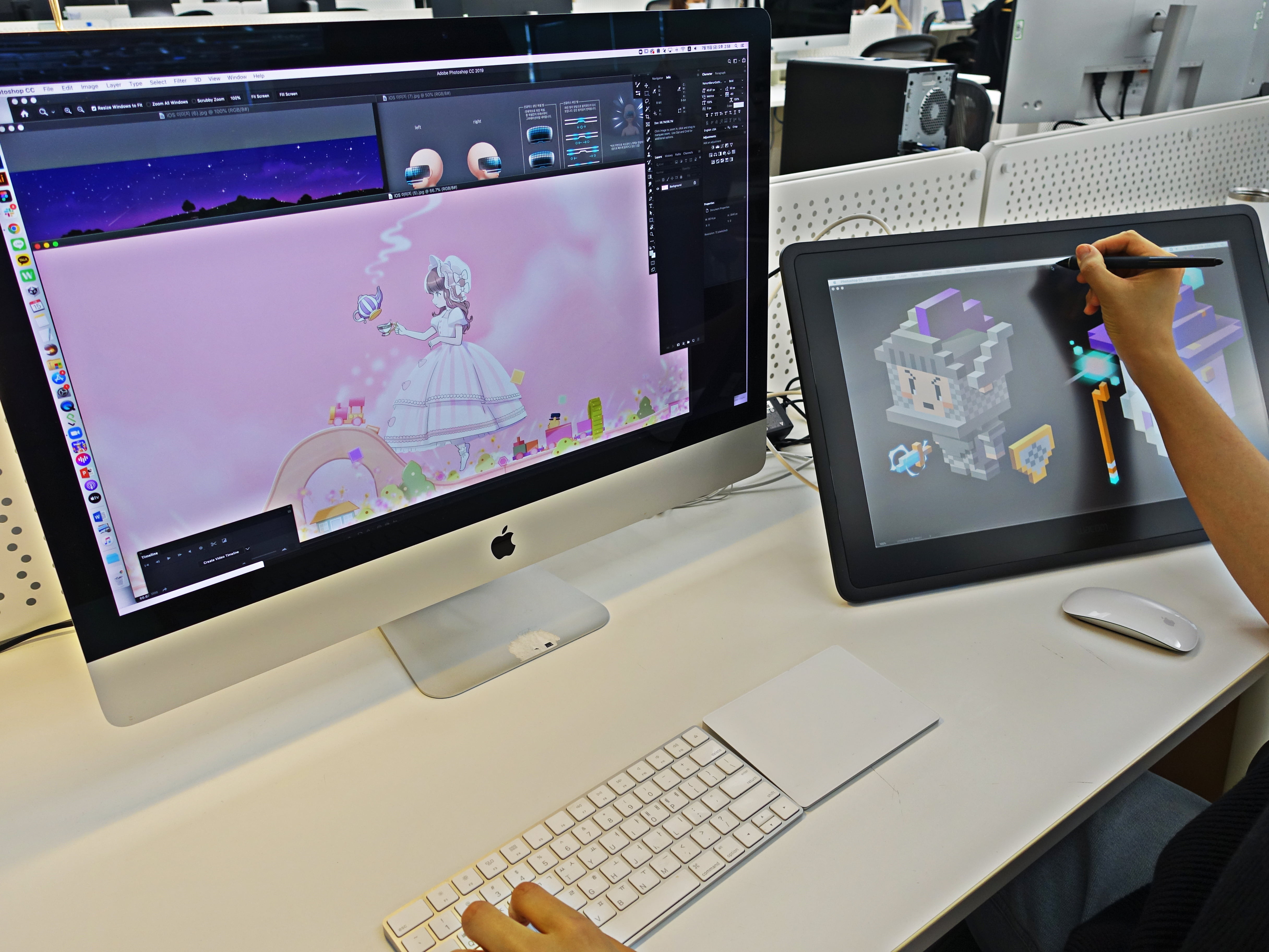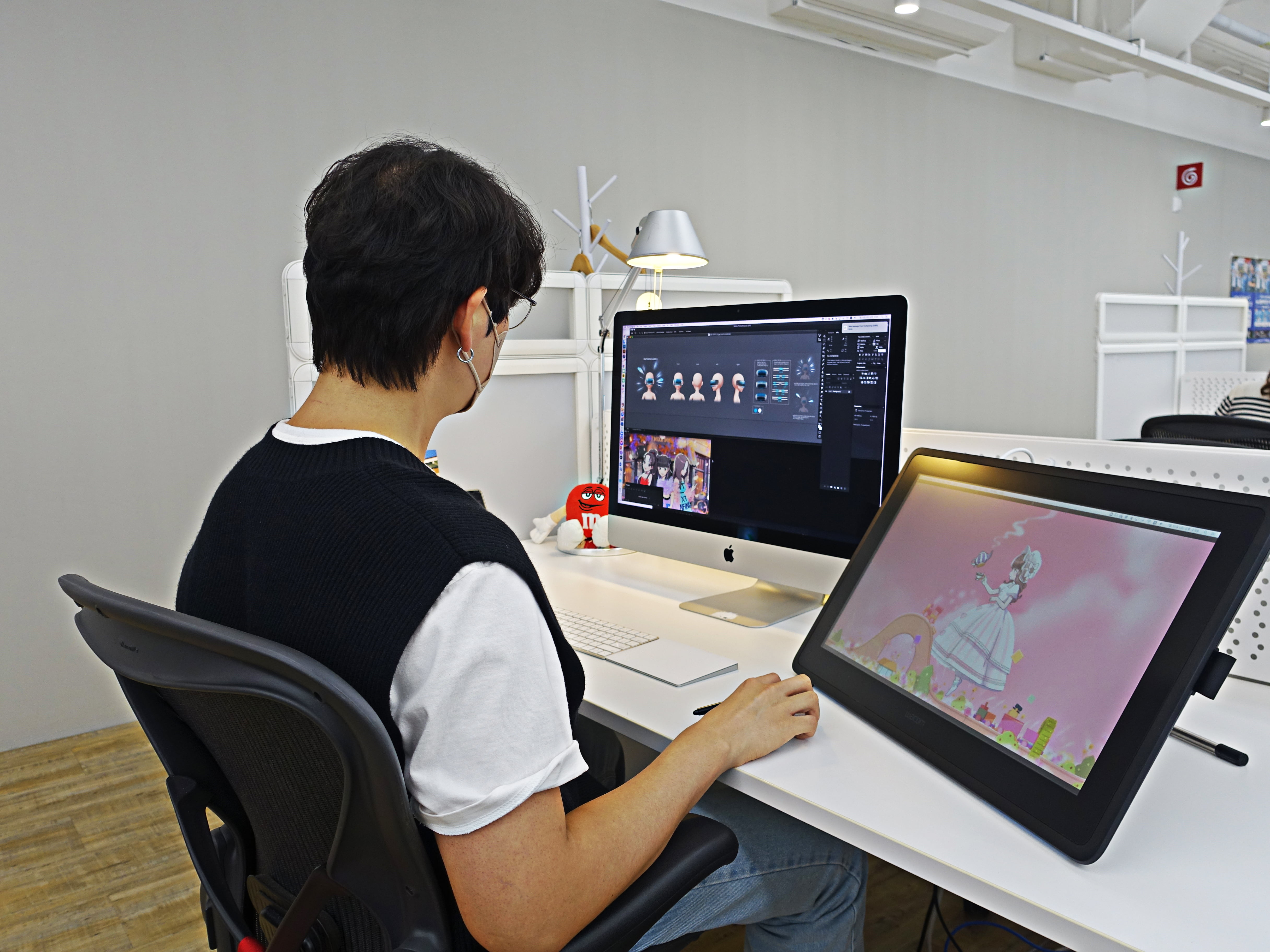 A. 먼저, 제작에 있어 가장 중요한 요소는 최신 트렌드를 발 빠르게 반영하는 것이에요. 아이템이나 월드 맵을 제작할 때, 기획적으로 논의하고 그 아이디어를 여러 테스트하는 과정을 통해 큰 그림을 함께 만들어냅니다. 그런 다음 모양과 색과 같은 디테일한 디자인 작업이 이뤄집니다. 이 과정에서 주로 포토샵과 유니티를 사용하고 있는데요. 보다 정교한 작업을 위해 와콤 신티크프로는 저희 팀에게 없어서는 안 될 필수템이랍니다! 이렇게 와콤 타블렛으로 디자인 작업을 끝내면 마지막으로 3D 모델링 거쳐 여러분들이 사용할 수 있는 아이템이나 월드맵으로 따-단하고 탄생하게 됩니다.