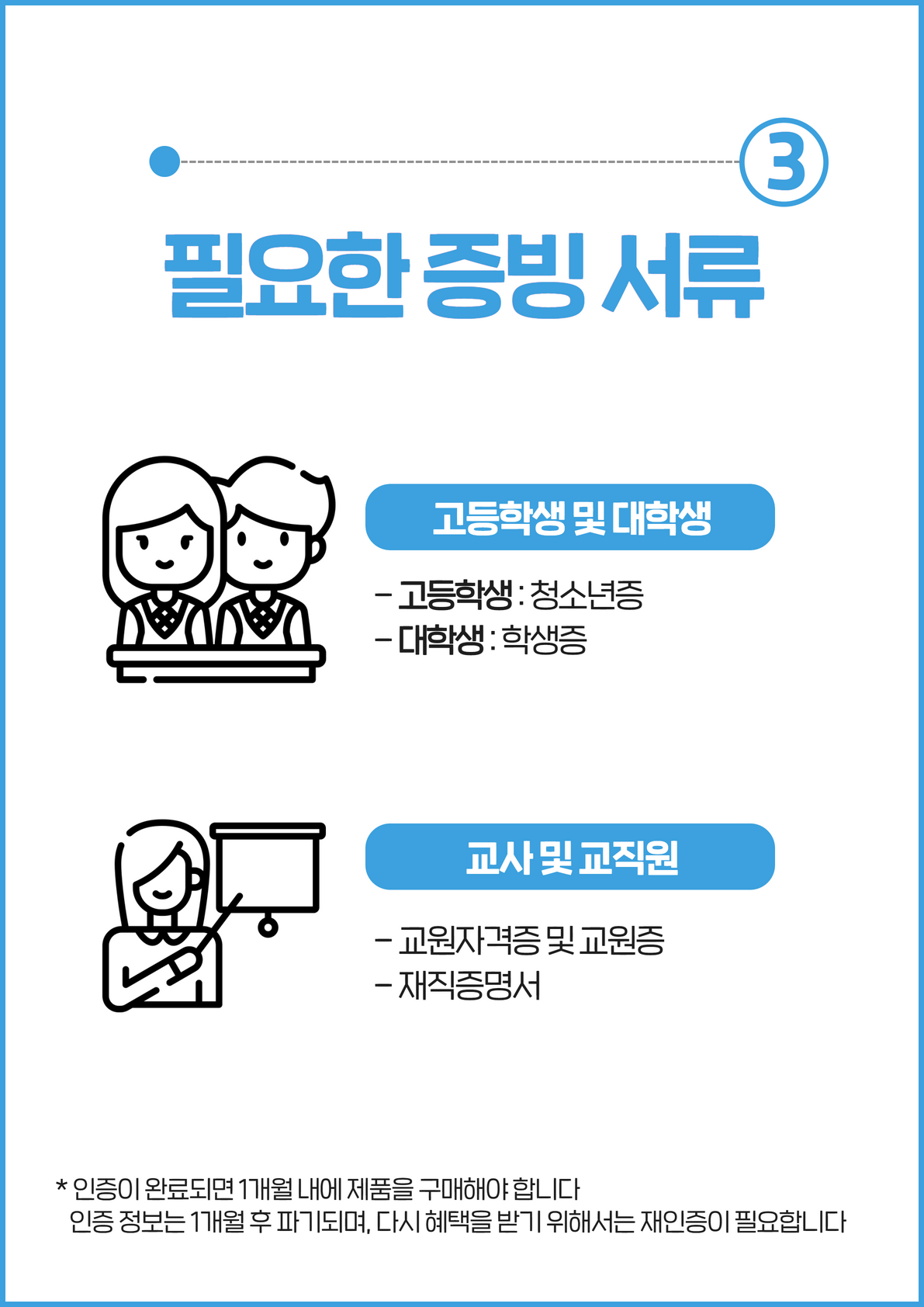 만 14세 이상의 고등학생은 청소년증, 대학생은 학생증으로 증빙이 가능하며, 교사 및 교직원은 교원자격증이나 교원증, 재직증명서 인증을 통해 할인 대상 여부를 확인받을 수 있답니다.