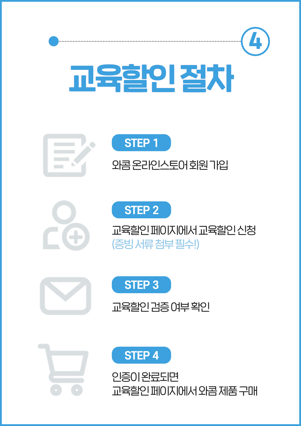 교육할인 신청 절차도 아주 간단해요. 가장 먼저 와콤 공식 온라인스토어에 가입한 후, 교육할인 페이지에서 신청 페이지로 넘어가서 증빙 서류를 첨부하고 제출합니다. 검증을 거쳐, 대상자로 확인되면 교육할인 페이지에서 와콤 제품을 구매할 수 있습니다. 정말 간단하죠? 인증이 완료되면 1개월 내에 제품을 구매해야 해요. 인증 정보는 1개월 후 파기되니, 그 이후에 다시 혜택을 받기 위해서는 다시 재인증 절차를 거쳐야 합니다.