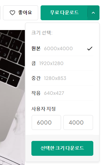 우측의 무료 다운로드 버튼을 누르면 사이즈별로 다운로드 가능합 옵션이 나옵니다. 이미지 사이즈도 미리 알려주기 때문에 원하는 용량에 맞게 선택할 수 있어서 좋아요. 다운로드 버튼을 누르면 가입하지 않은 상태에서도 이미지를 내려받을 수 있습니다.