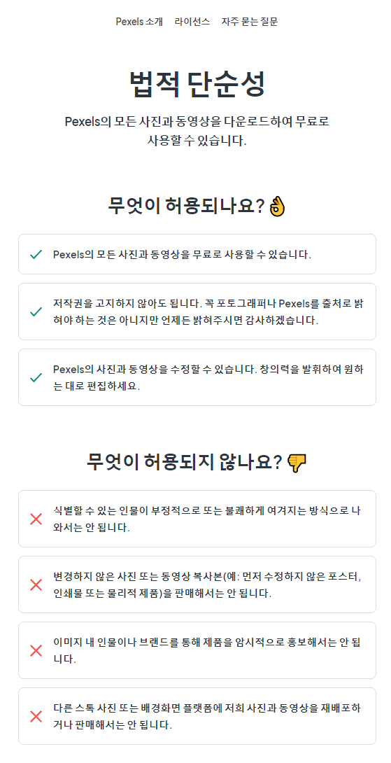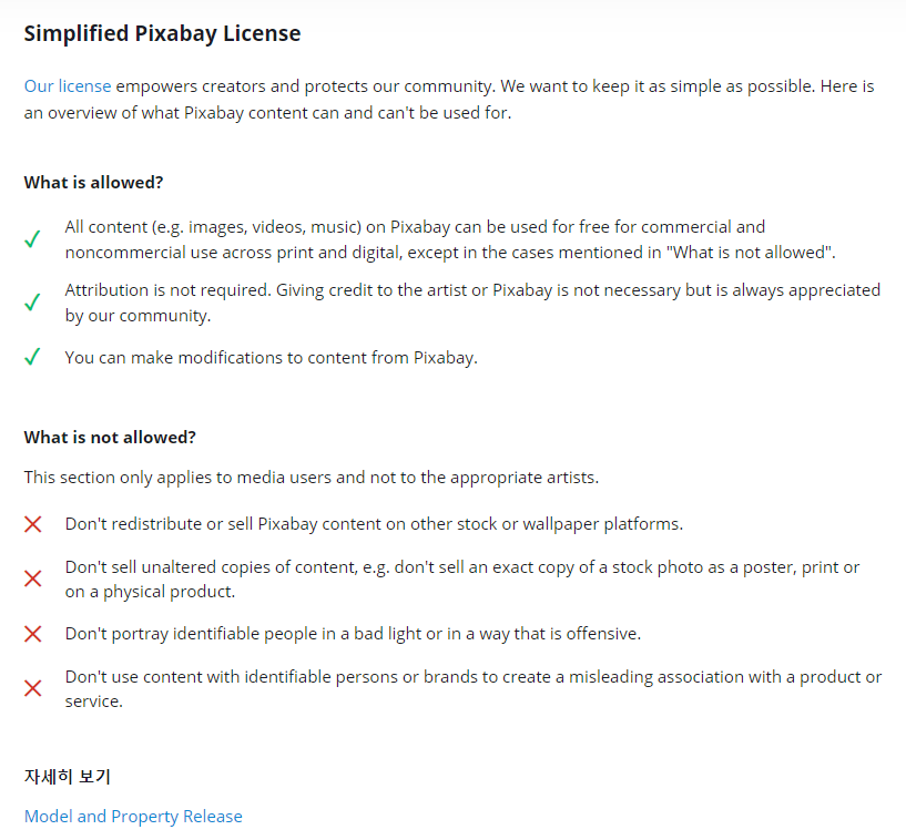 픽사베이 역시 라이센스 페이지가 마련되어 있습니다. 이미지를 보면, 허용되지 않는 아래 내용을 제외하고는 모든 콘텐츠를 상업적이거나 비상업적으로 사용할 수 있다는 것을 알 수 있습니다. 언스플래시와 마찬가지로 굳이 저작자를 표기하지 않아도 되고요.