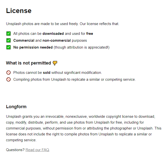 대신, 다운로드한 사진을 그대로 판매하는 행위는 허락되지 않습니다. 그외에 사진 이용과 관련된 세부사항은 FAQ에서 확인할 수 있으니, 언스플래시 사진을 상업적으로 이용하기를 원한다면 반드시 확인 후 진행하기를 추천해요!