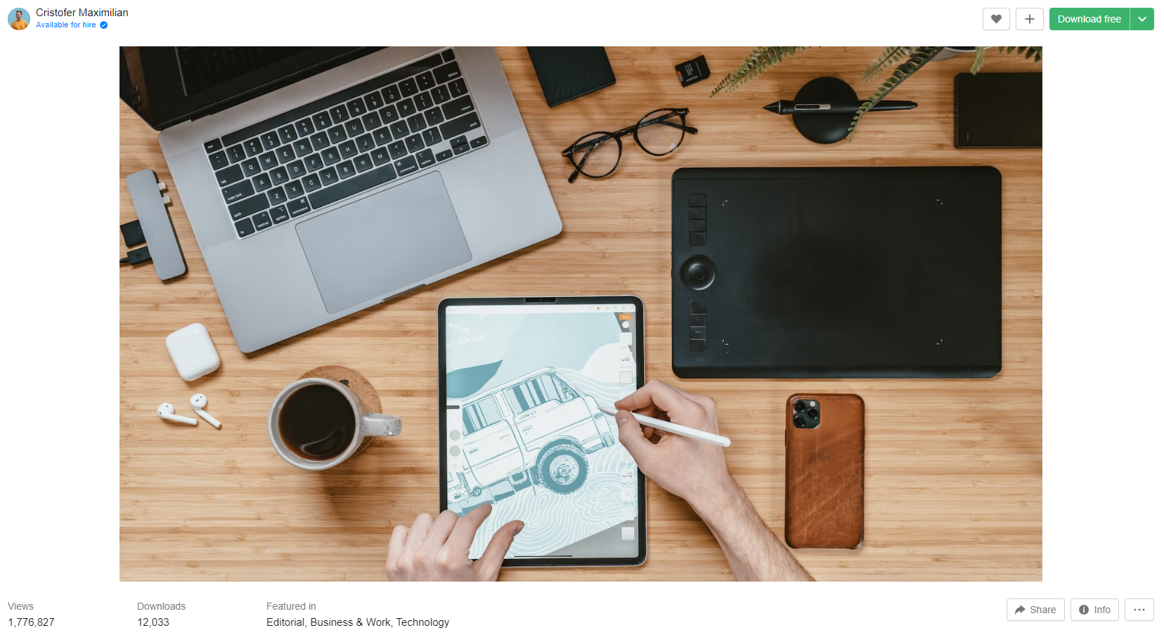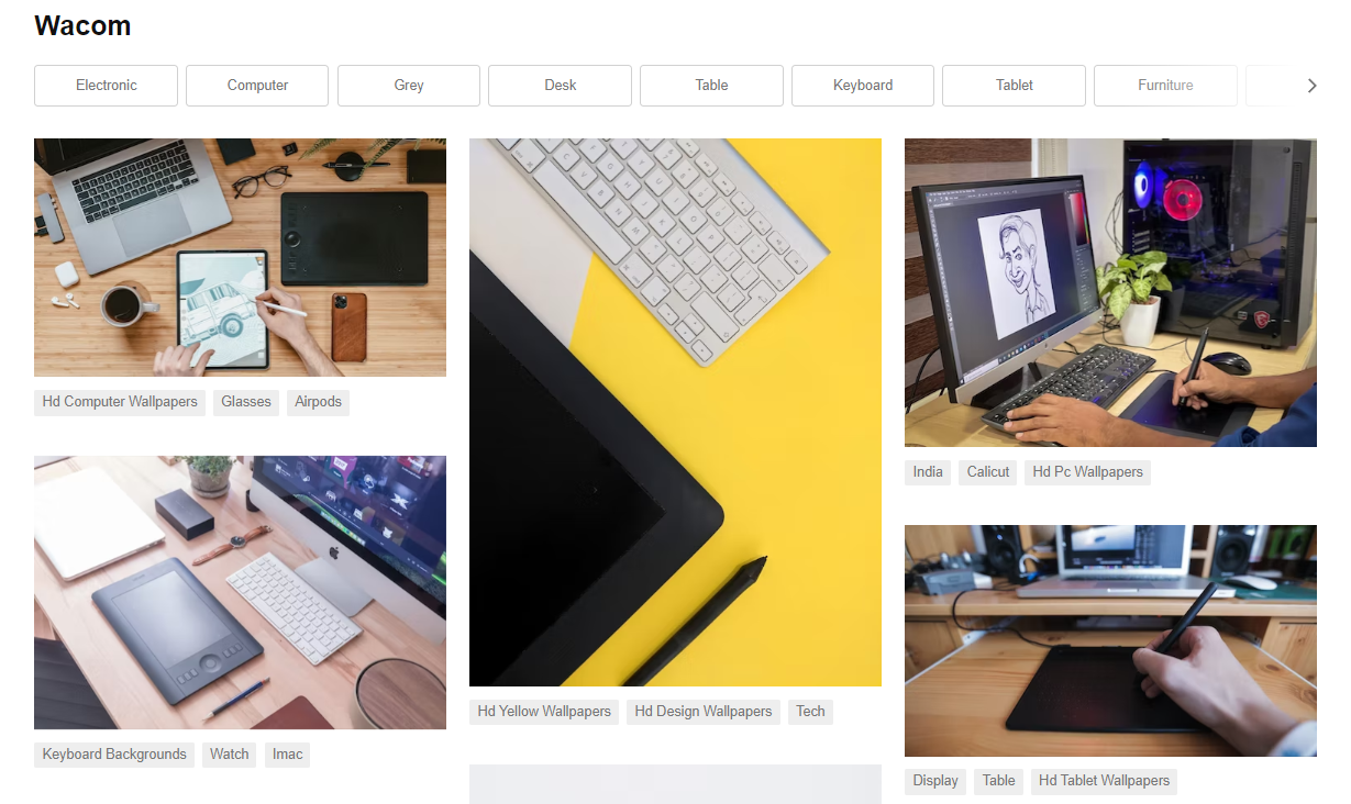 첫 번째로 소개하는 곳은 고화질 이미지의 대표주자, 언스플래시입니다. 전세계 각지의 포토그래퍼들이 촬영한 사진이 올라오는 곳으로, 해상도가 매우 높은 사진을 무료로 다운로드할 수 있어서 인기가 많은 사이트에요. 상단에 있는 검색창에 원하는 키워드로 검색할 수 있는데요, 블로그지기는 Wacom을 한 번 검색해 보았습니다.