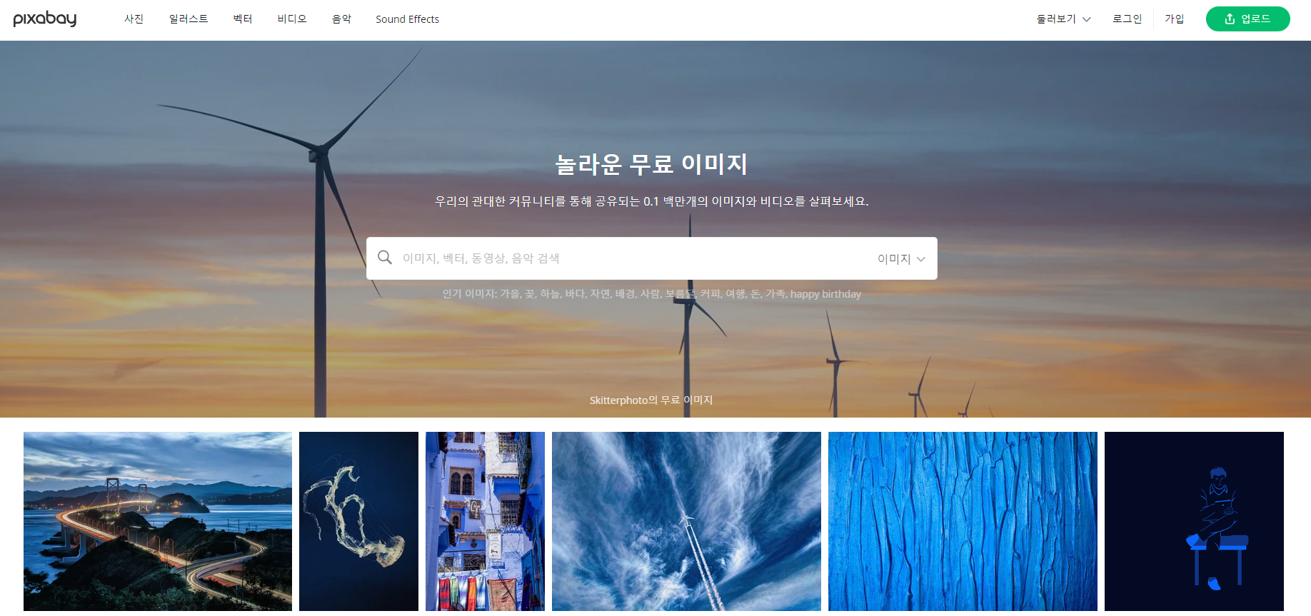 두 번째로 소개하는 사이트인 픽사베이 또한 업로드된 이미지를 자유롭게 사용 가능한 사이트입니다. 사진뿐만 아니라 일러스트, 벡터, 동영상까지도 제공하고 있기 때문에, 다양한 미디어 콘텐츠를 제작할 때 참고하기를 추천해요.