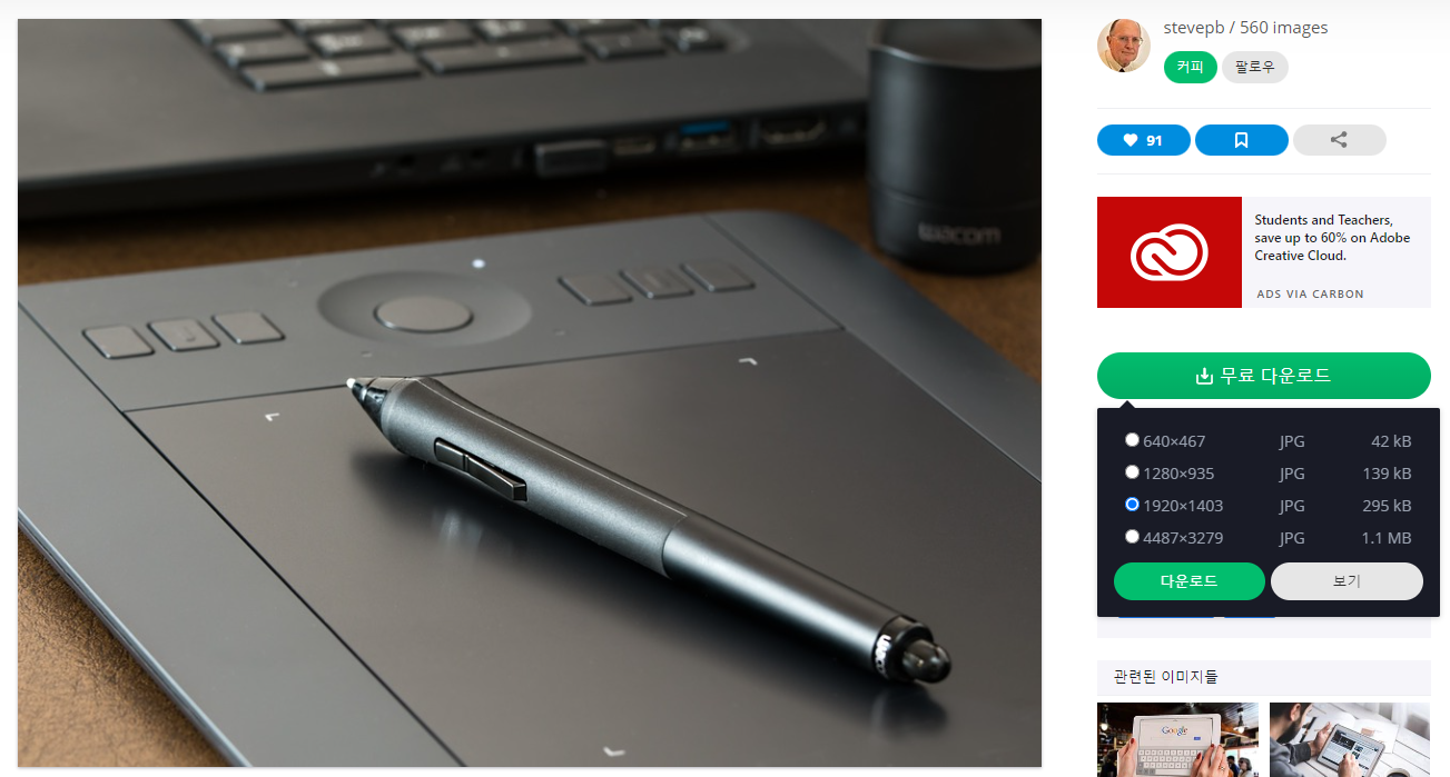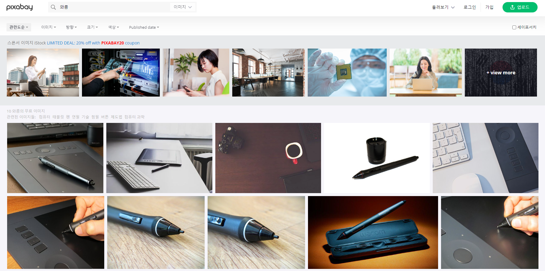픽사베이에서도 와콤을 한 번 검색해 보았습니다. 특이하게도 영문명인 wacom으로 검색했을 때보다 한국어로 와콤이라고 검색했을 때 결과가 더 많이 나오네요. 역시 익숙한 우리의 펜타블렛들이 보이지요. 그 중에 하나를 골라 다운로드해볼게요.