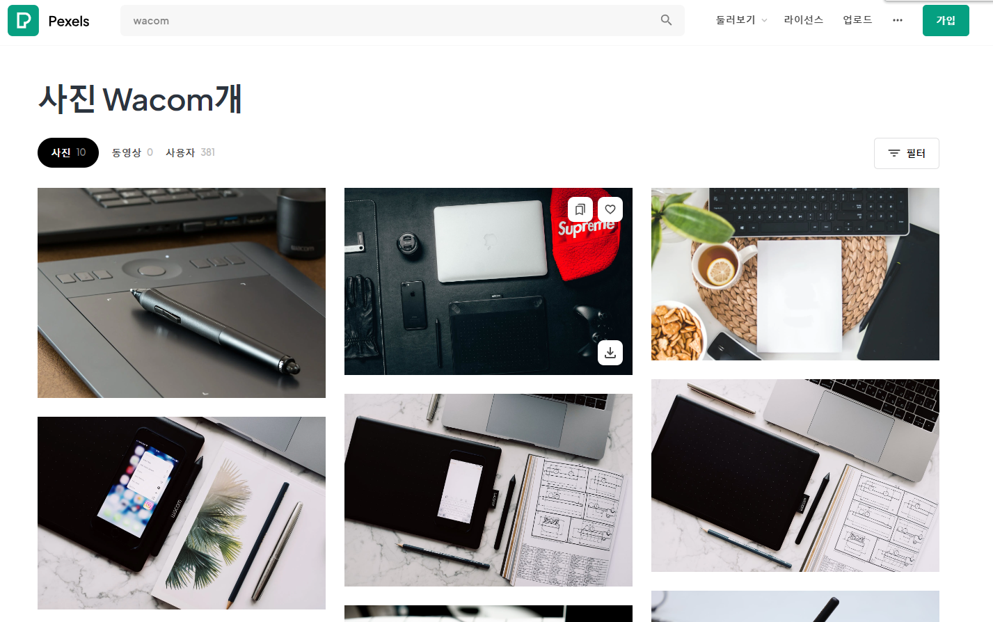 픽사베이에서도 와콤을 한 번 검색해 보았습니다. 특이하게도 영문명인 wacom으로 검색했을 때보다 한국어로 와콤이라고 검색했을 때 결과가 더 많이 나오네요. 역시 익숙한 우리의 펜타블렛들이 보이지요. 그 중에 하나를 골라 다운로드해볼게요.
