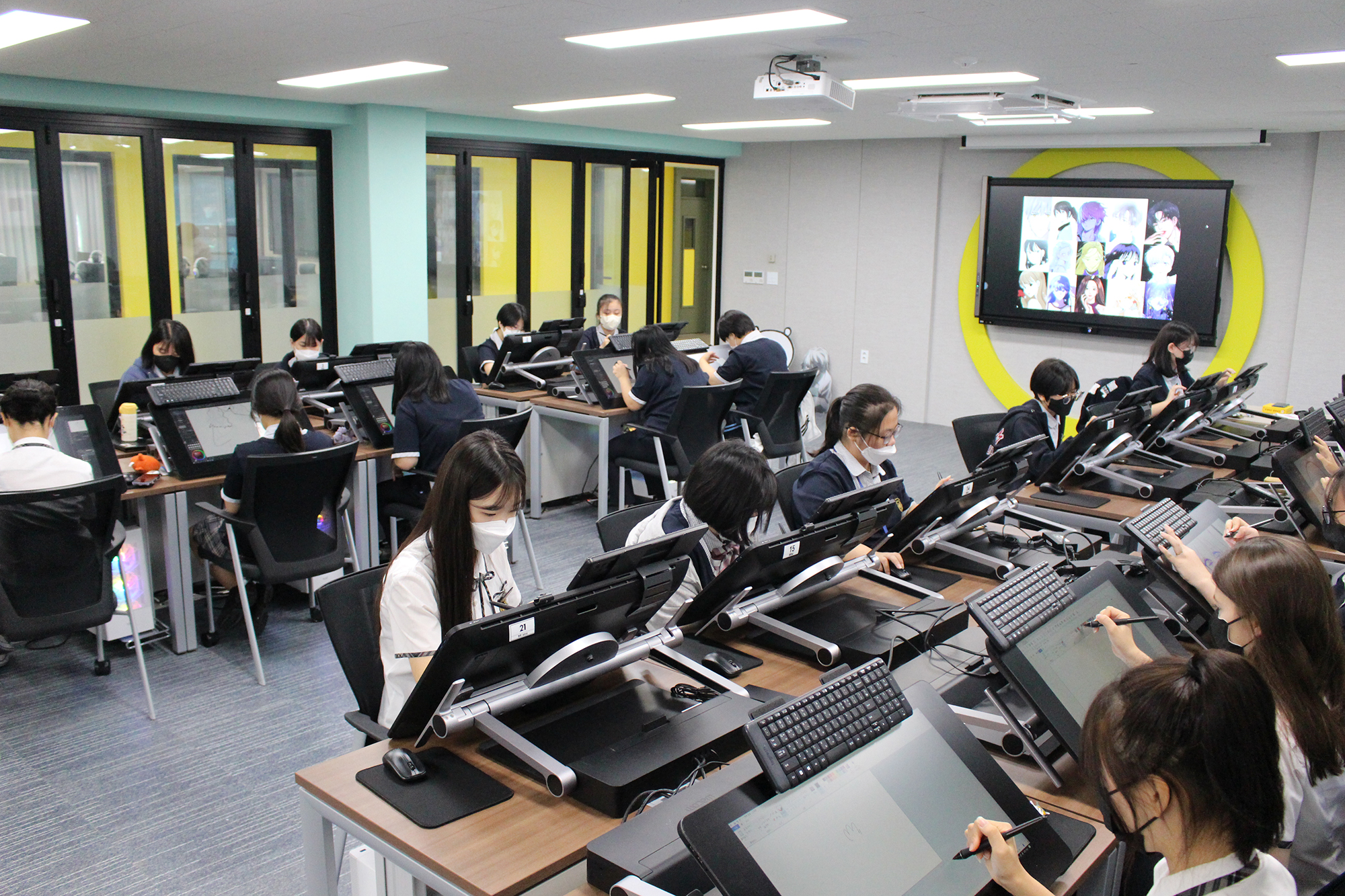 성암국제무역고등학교는 올해 국제문화콘텐츠과를 개설하면서 적극적인 투자를 통해 창작 교육 인프라를 구축했습니다. 웹툰 실습실에 웹툰 및 콘텐츠 제작 분야의 현업 전문가들이 사용하는 와콤 신티크프로24와 에르고 스탠드 풀 세트 23대를 도입한 것이지요. 와콤 신티크프로24는 뛰어난 창작 경험을 제공하는 최고 사양의 타블렛으로, 학생들은 학교에서 고성능 기기를 활용해 실습할 수 있게 되었어요. 현재 경기모바일과학고, 성보경영고, 인천금융고 등 창작 관련 학과를 운영하는 특성화 고교에도 신티크프로24 풀 세트가 구축되어 있습니다.
