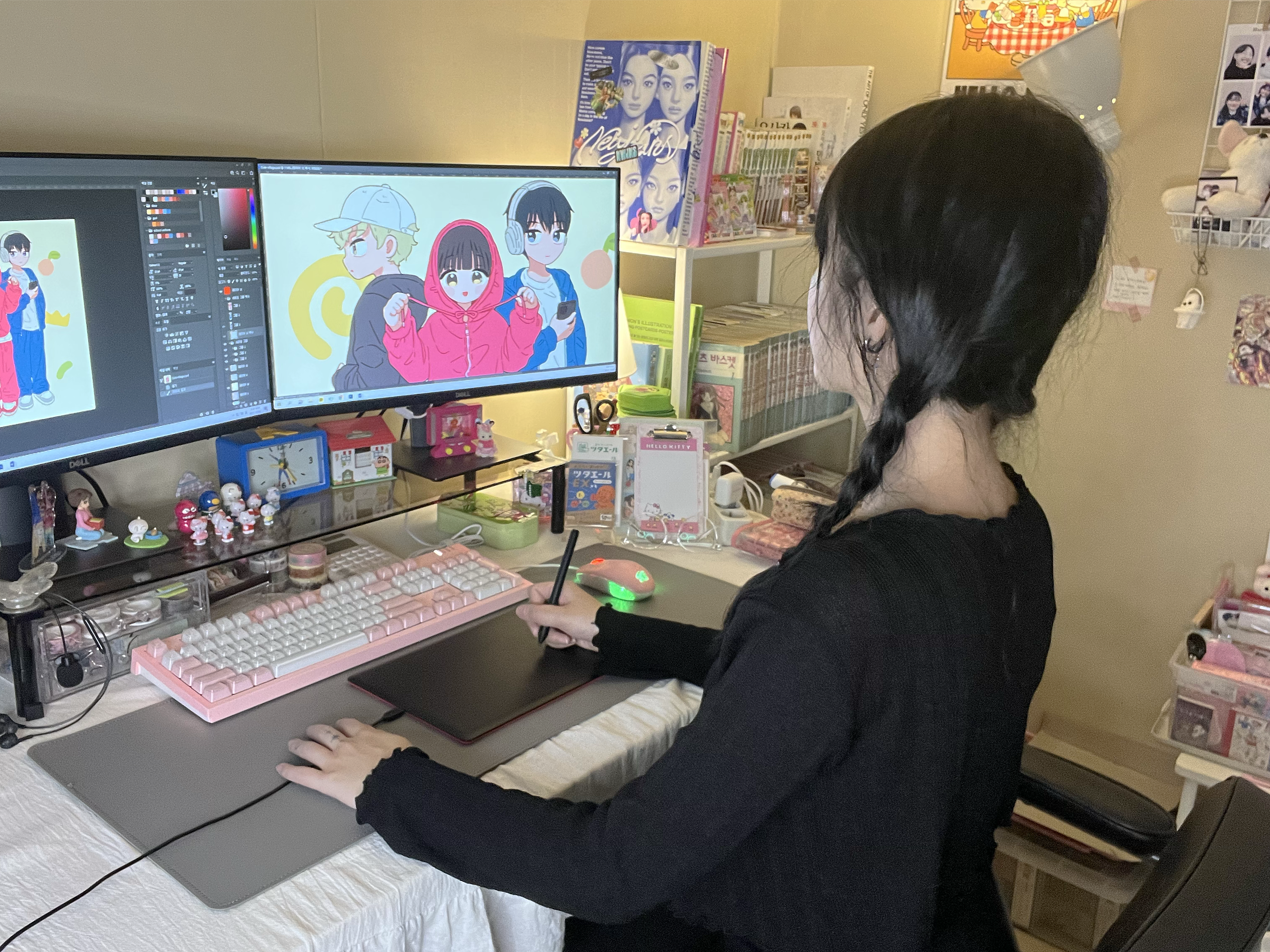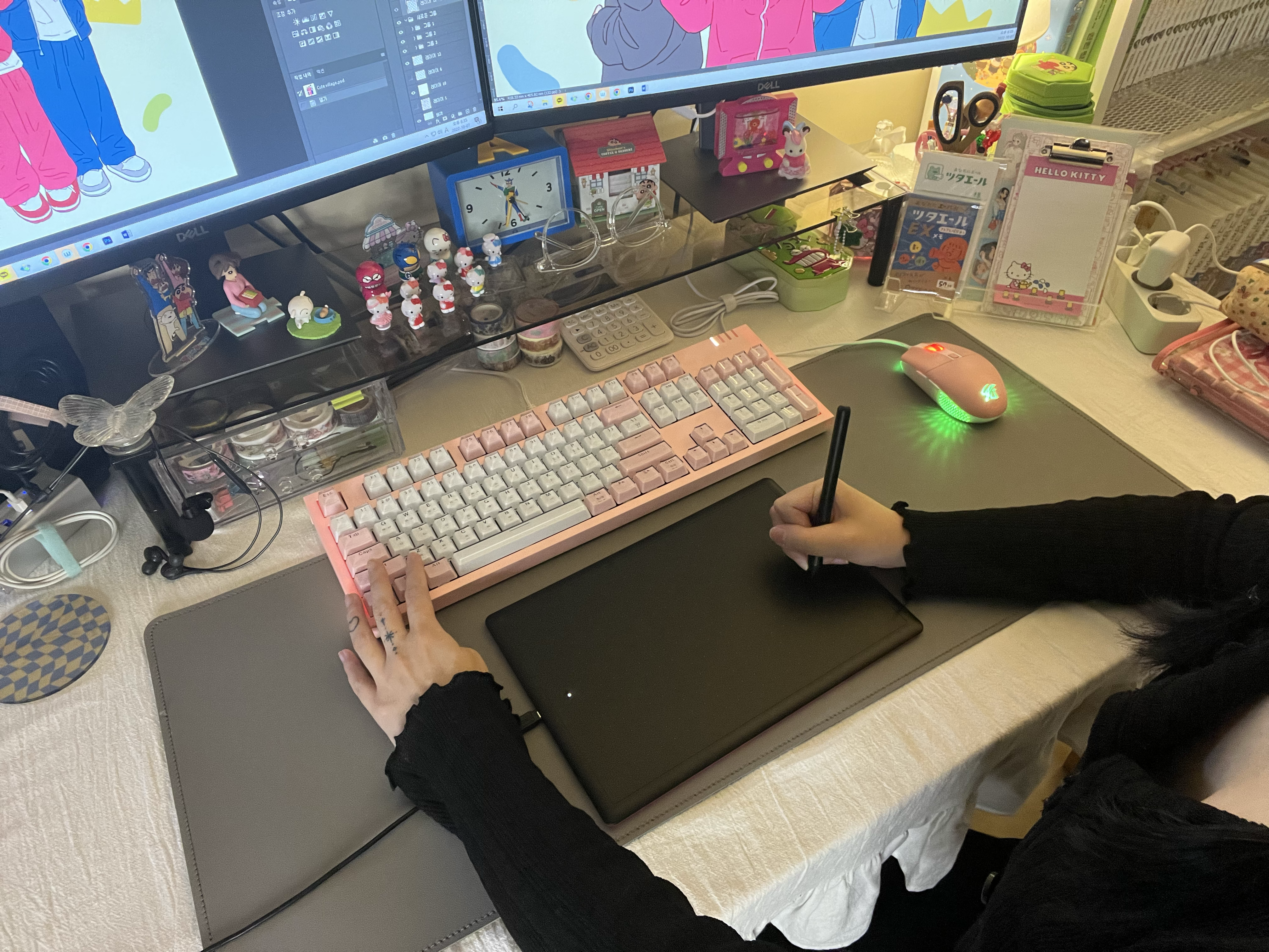다양한 레퍼런스를 참고하기 위해서 듀얼 모니터를 함께 사용하고, 책상 주변에는 영감을 주는 다양한 굿즈와 만화책이 가득해요. 책상이 넓은 편은 아니라 효율적인 사용을 위해 작업할 때마다 펜타블렛을 꺼내서 사용하곤 합니다. 허리를 꼿꼿하게 편 바른 자세로 시선은 모니터에, 손은 타블렛에 두고 작업을 해요. 이동할 일이 있으면 노트북과 펜타블렛을 들고 다니며 작업하기도 한답니다.