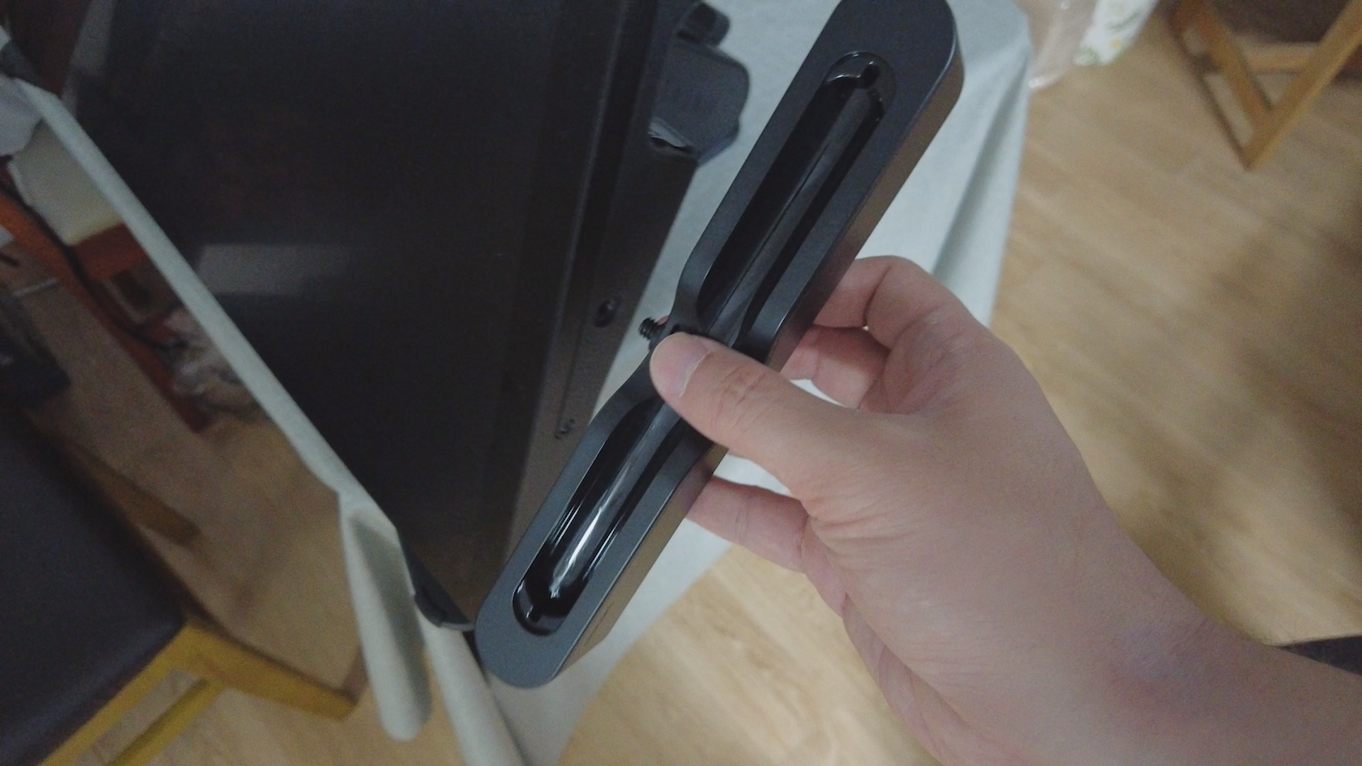 그리고 펜 보관함은 신티크 프로 27 본체에 연결해서 편하게 거치할 수 있어요. 위 사진에서 본체 쪽에 있는 구멍이 보이시나요? 바로 이 스크류 홀이 제품 양쪽과 위쪽에 총 4개 있는데, 이 구멍에 맞추어 펜 보관함을 끼워주면 됩니다. 펜 보관함뿐만 아니라, 스마트폰 거치대나 웹캠, 별도로 판매하는 익스텐션 테이블 등 다양한 액세서리를 함께 사용할 수 있어요.