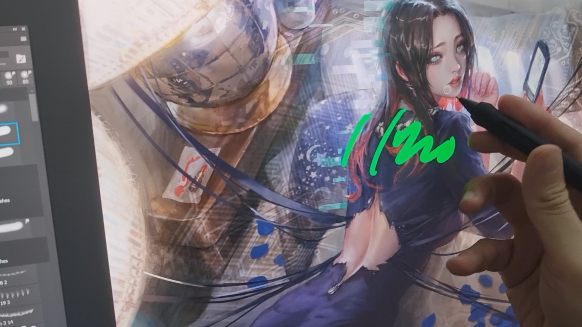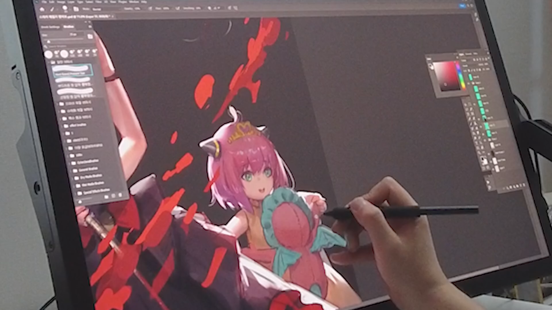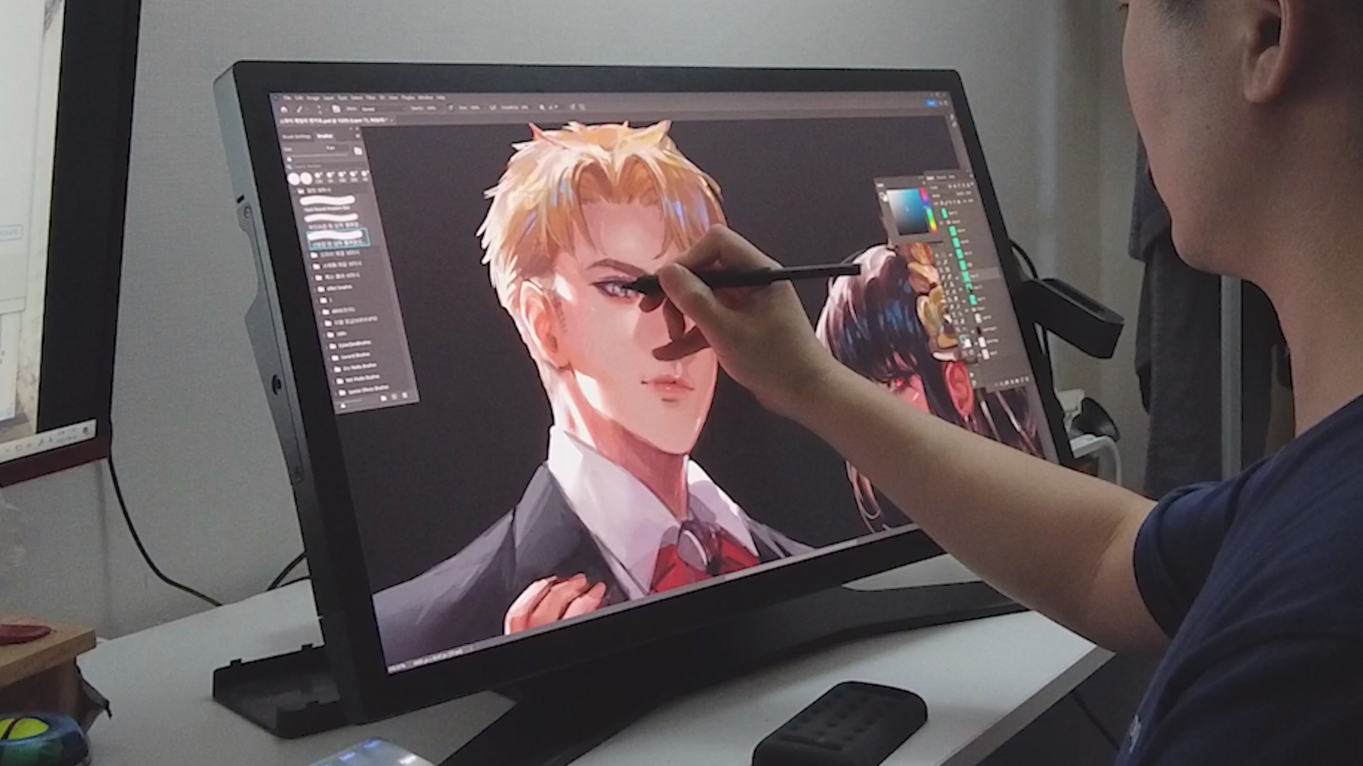 인슈님의 손에서 그려지는 멋진 일러스트. 위 이미지를 보시다시피 와콤 신티크 프로 27은 27인치라는 커다란 크기에도 불구하고 베젤이 매우 얇고 슬림해요. 덕분에 자리를 차지하는 공간이 적어지면서 공간 활용도가 높아졌습니다. 또, 신티크 프로 27의 디스플레이는 어도비 색재현율, 팬톤 컬러 인증에 이어 120Hz 주사율까지 더해져 뛰어난 색감과 부드러운 사용감까지 모든 것을 갖추었습니다. 인슈님에 따르면, 작업뿐만 아니라 영화를 감상하거나 게임할 때도 유용할 것이라고 하네요.