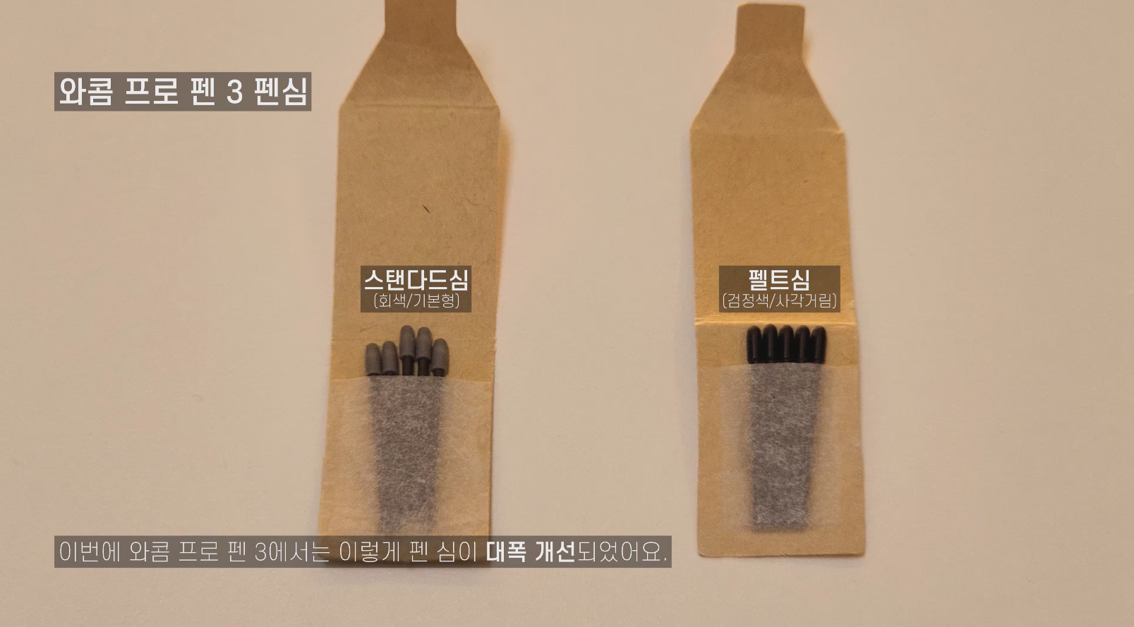 와콤 프로 펜 3은 펜심에서도 변화가 있었는데요, 기본 스탠다드심은 회색 컬러, 사각거리는 느낌이 특징인 펠트심은 검정색이에요. 프로 펜 2에서는 스탠다드심이 검정색이고, 펠트심이 회색이었던 것과 반대됩니다.